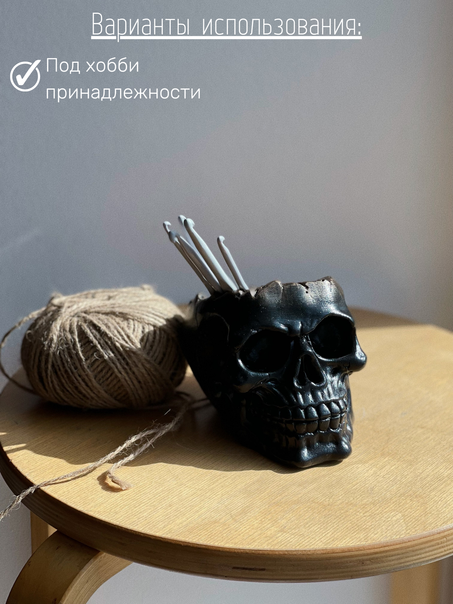 Кашпо-органайзер "Череп" в черном цвете, 10 см, гипс, декор для дома