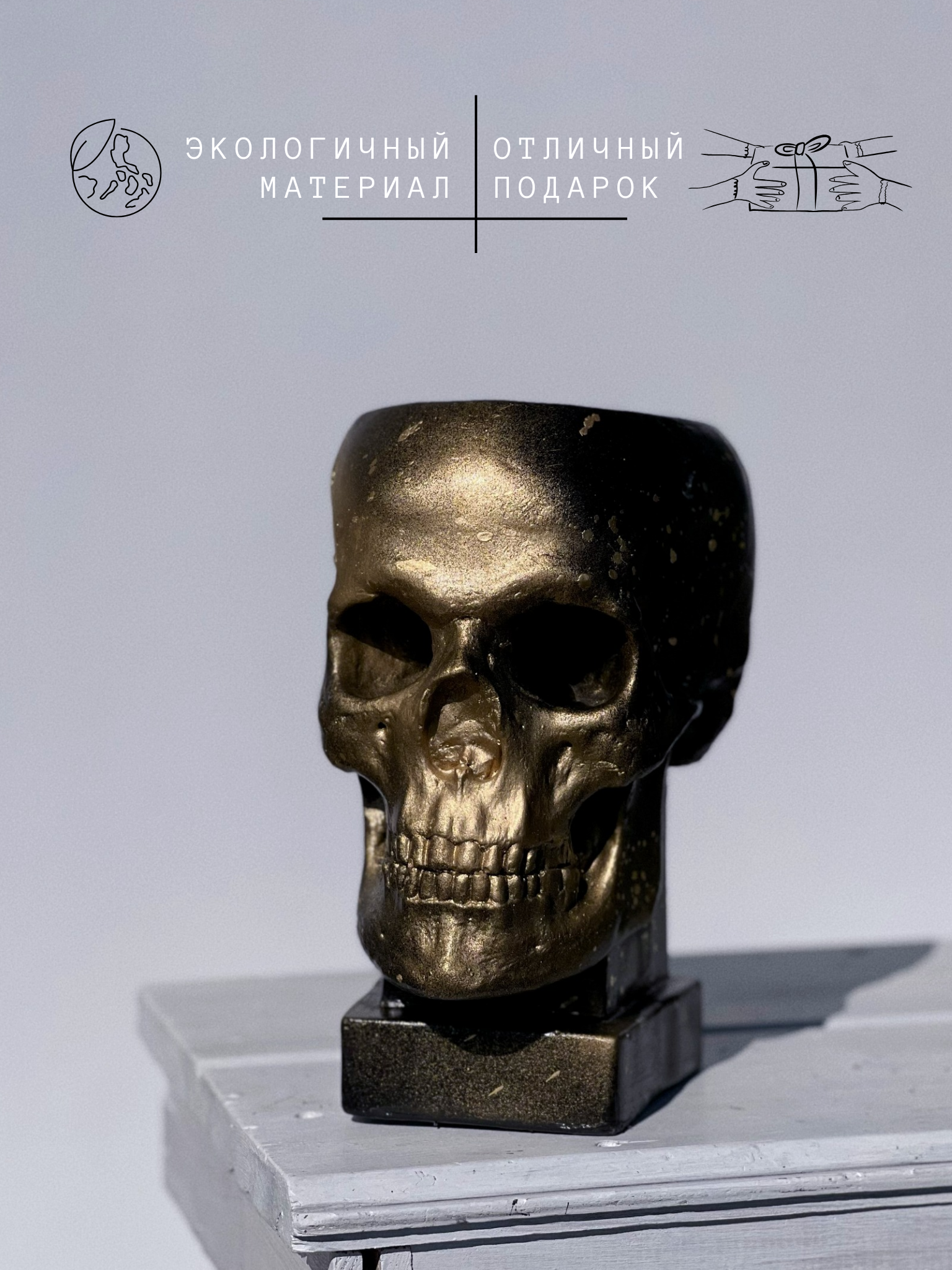 Кашпо из гипса Череп анатомический в черном цвете с золотом, 15 см, органайзер