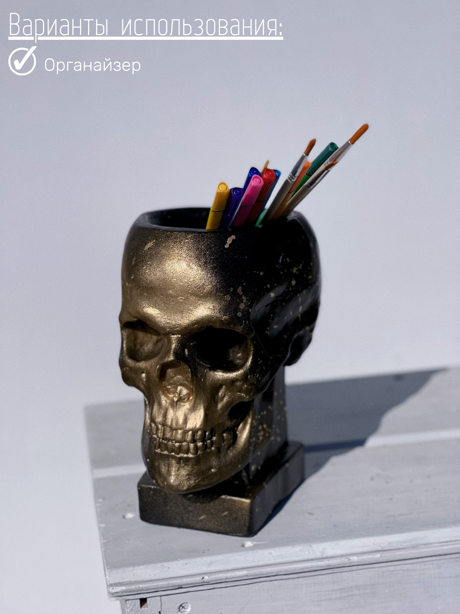 Кашпо-органайзер "Череп" в черном цвете с бронзой, 10 см, гипс