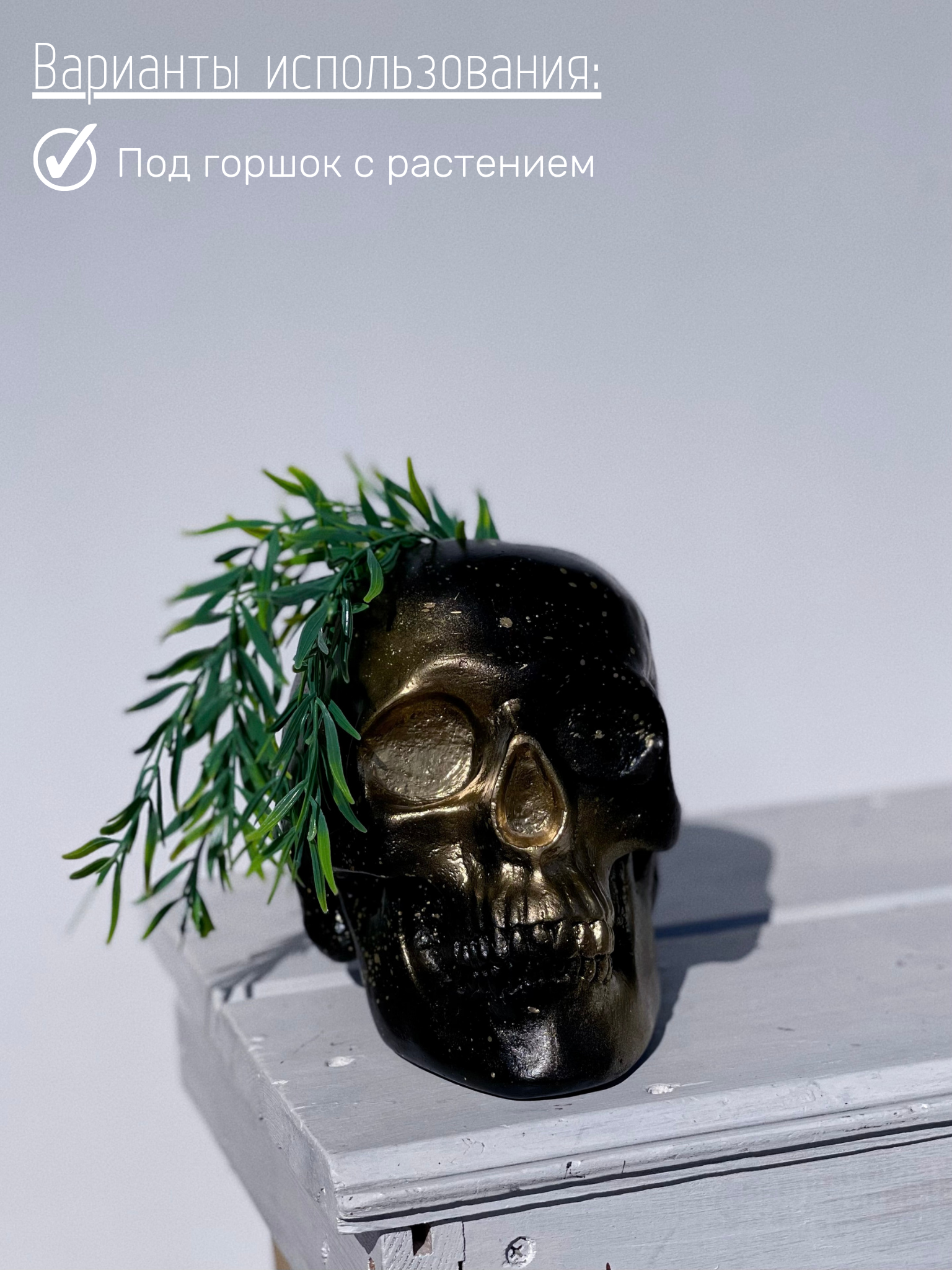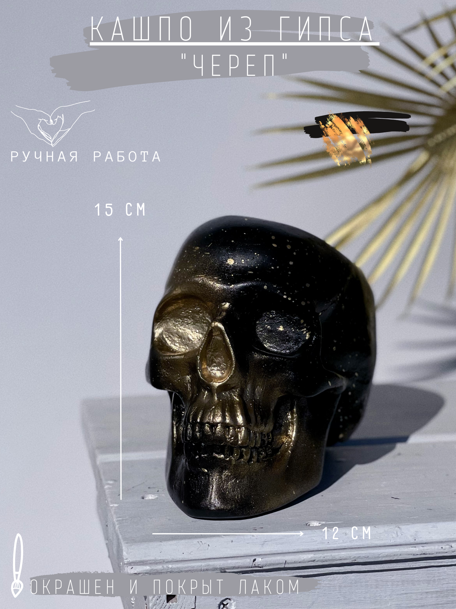 Купить Кашпо из гипса Череп анатомический в черном цвете с золотом, 15 см, органайзер