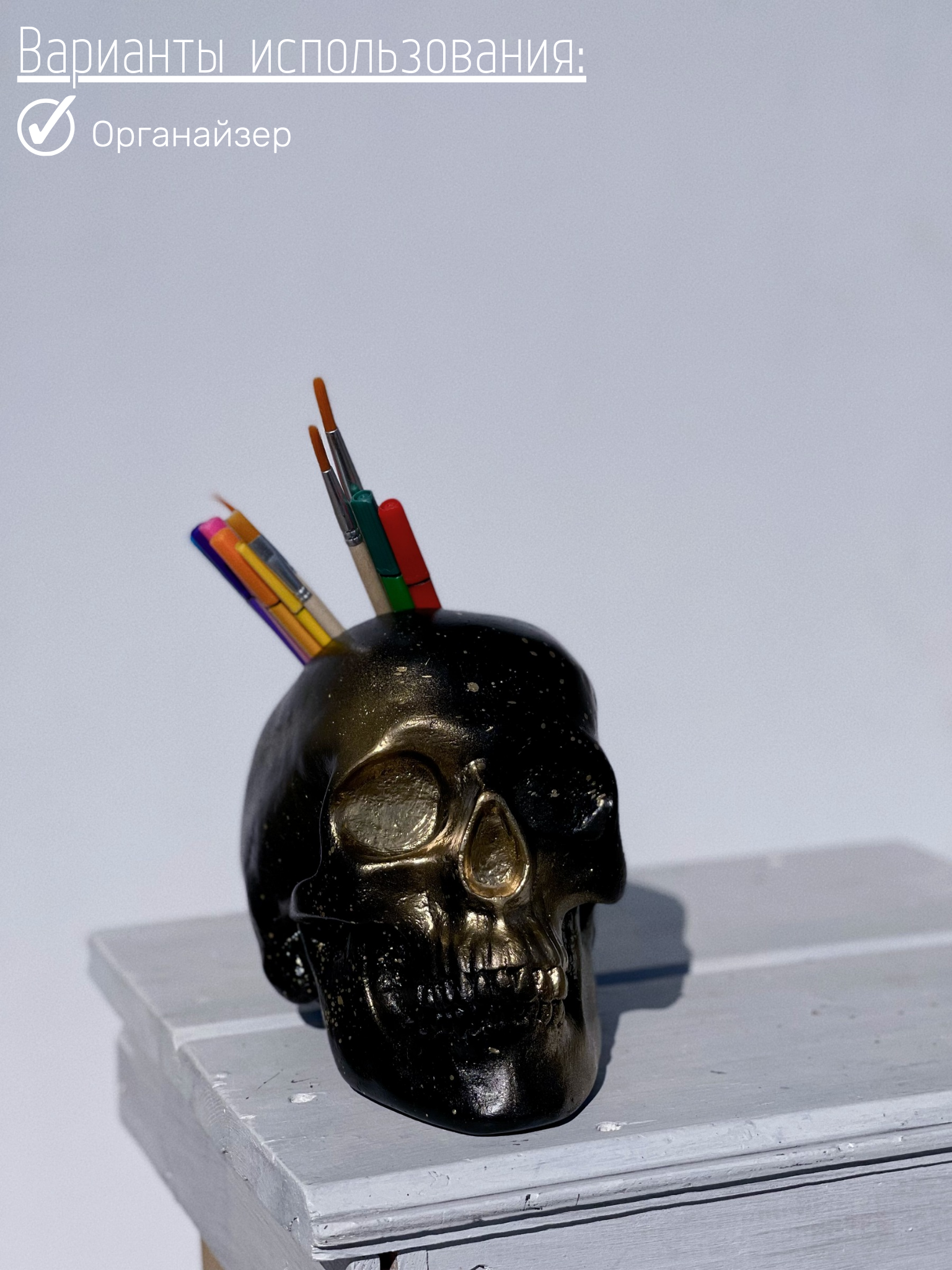 Кашпо-органайзер "Череп" в черном цвете с бронзой, 10 см, гипс