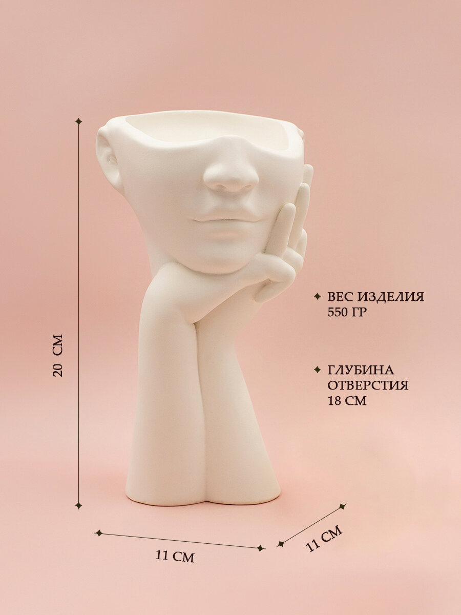 Декоративное кашпо белое из гипса для цветов голова девушка с руками Милота / Ваза для конфет