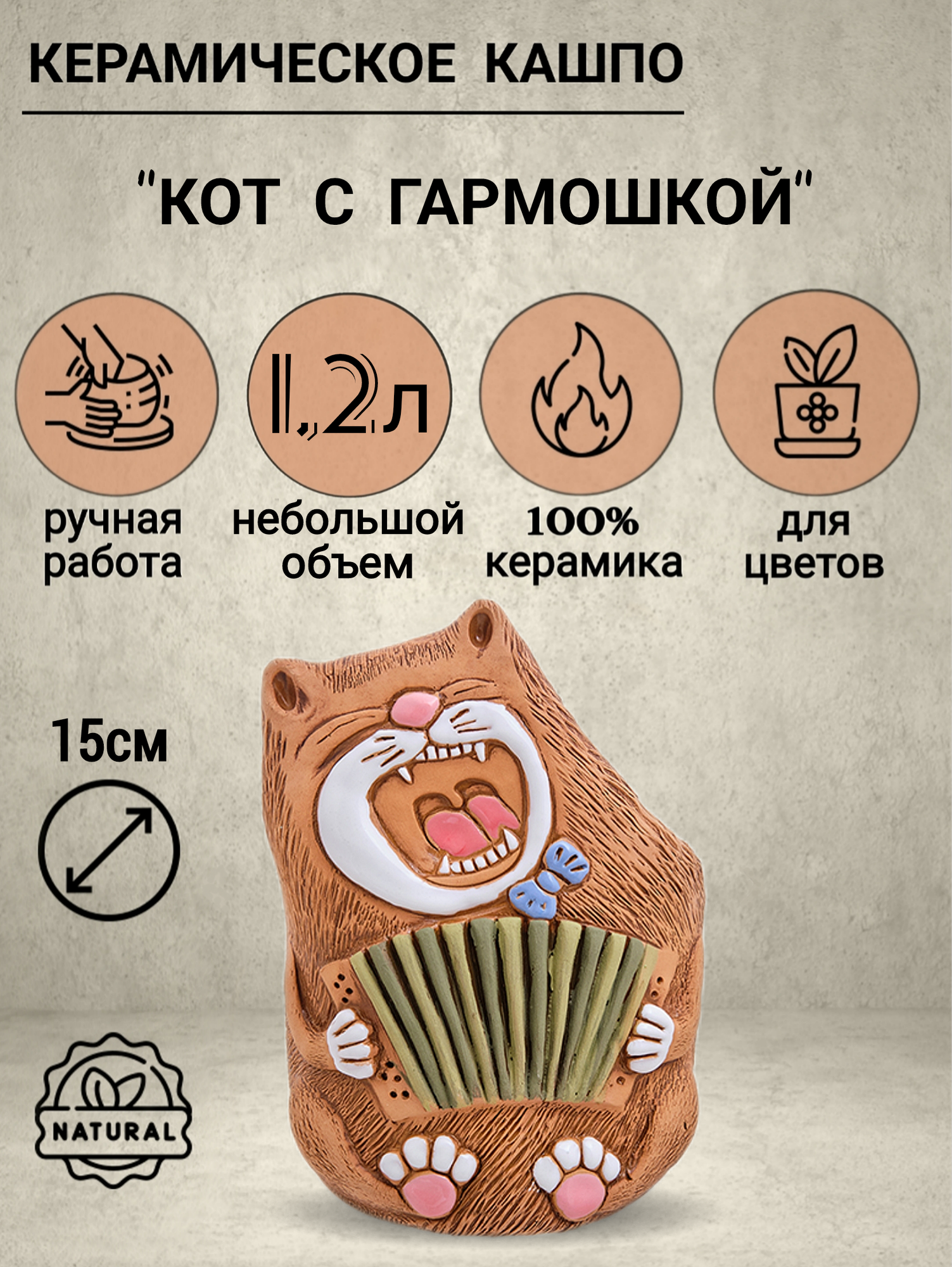 Авторское керамическое кашпо для цветов ручной работы, Кот с гармошкой интересное: