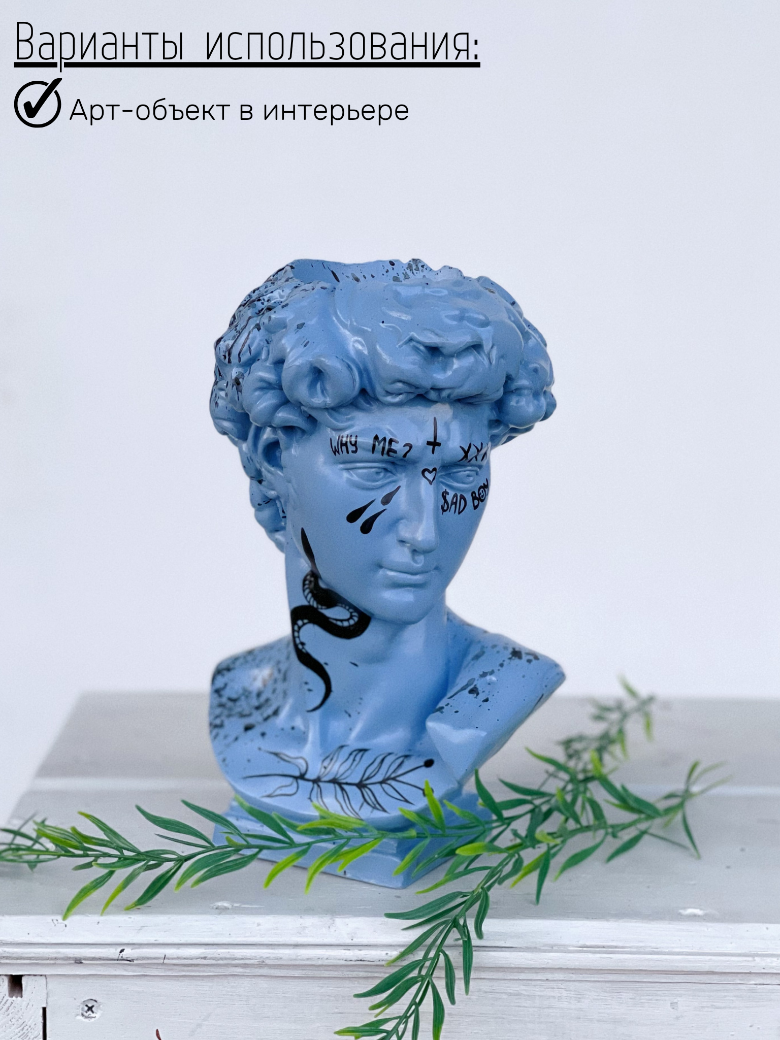 СохранитьКашпо-органайзер Бюст Давида декоративное, 25 см, гипс, голубой цвет с рисунками, со змеей интересное:
