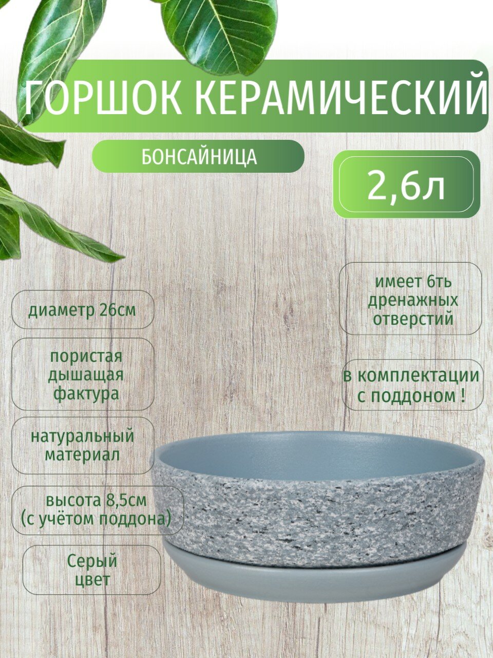 Купить Горшок для цветов, бонсайница, диаметр 26 см, высота 8,5 см, с поддоном, серый камень