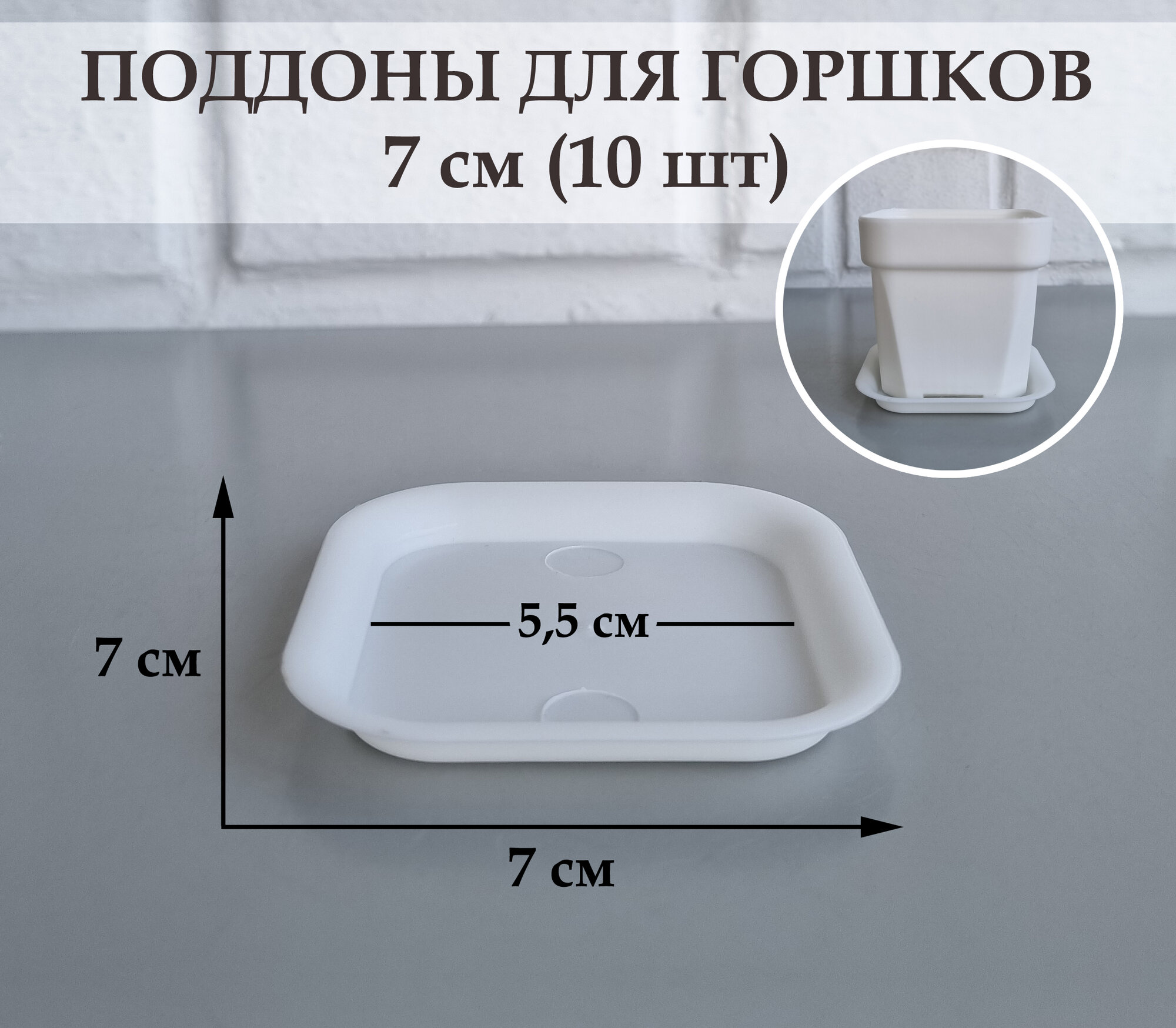 Квадратные поддоны для горшков, 8,5 х 8,5 см (внутр. 7,2 х 7,2 см). Белые. Набор из 10-ти штук
