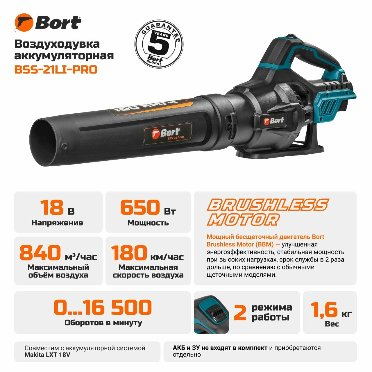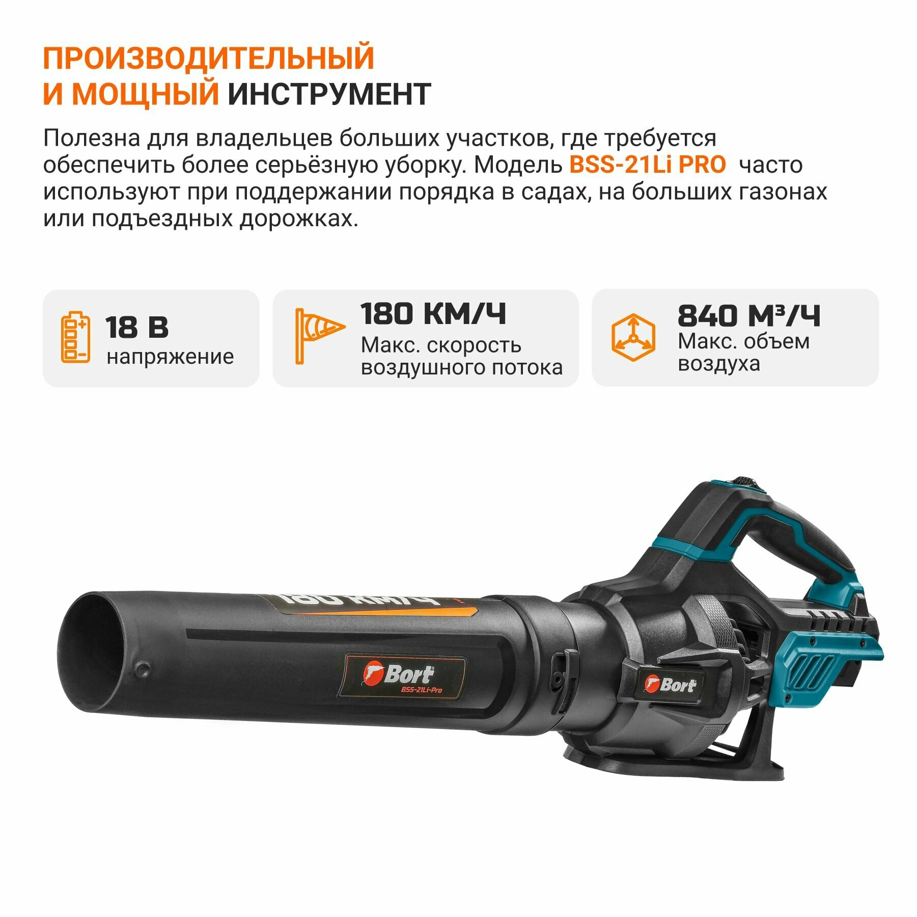 Купить Воздуходувка аккумуляторная BORT BSS-21Li-Pro (Бесщеточный, 840 м3/час, без аккумулятора и зарядного устройства)