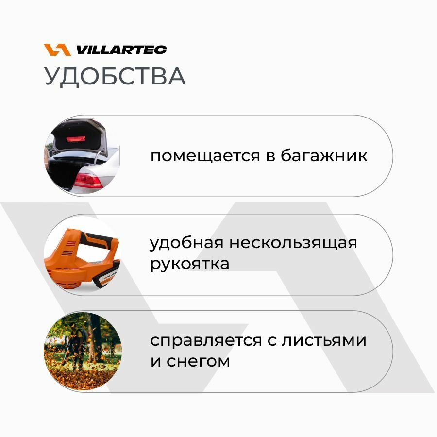 Воздуходувка аккумуляторная 20 В VILLARTEC BA20SET4 ( в комплекте аккумулятор и зарядное устройство) интересное: