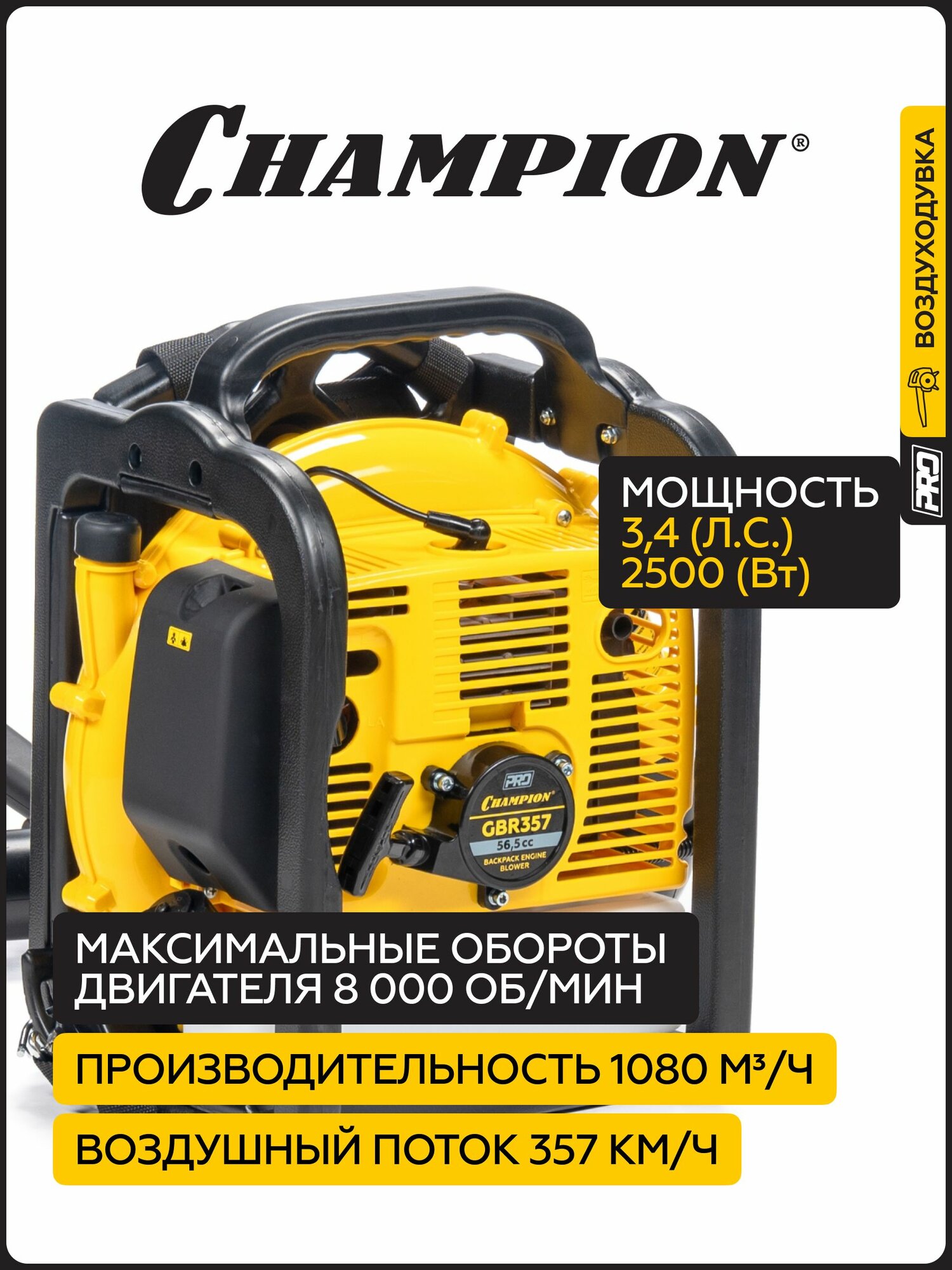 Воздуходувка бензиновая CHAMPION GBR357, 2,5 кВт, 1080 м3/ч, 99,4 м/с, 9,2 кг интересное: