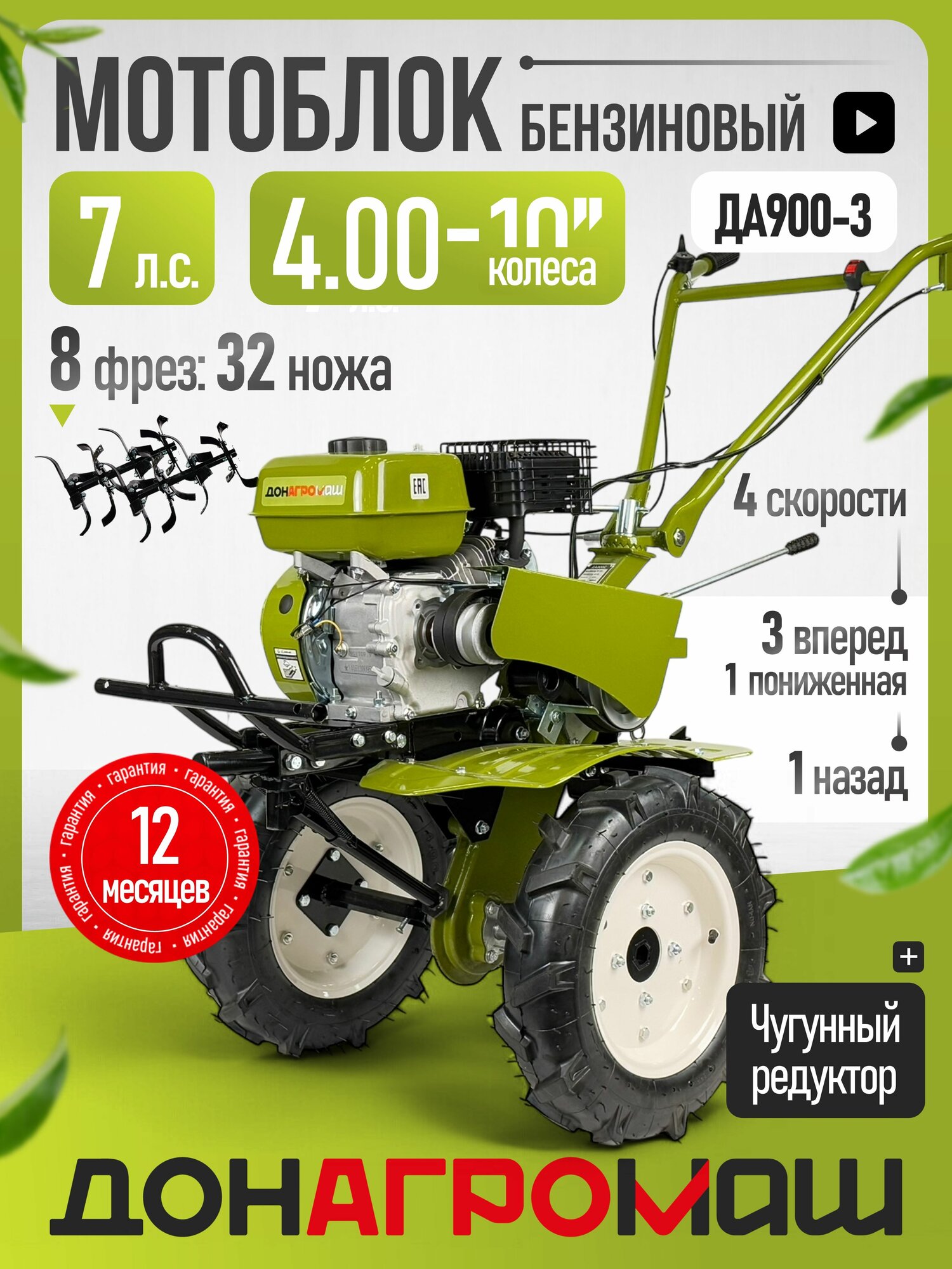 ДОНАГРОМАШ Мотоблок бензиновый ДА900-3 (7 л. с, 3 вперед / 1 назад, колеса 4х8)