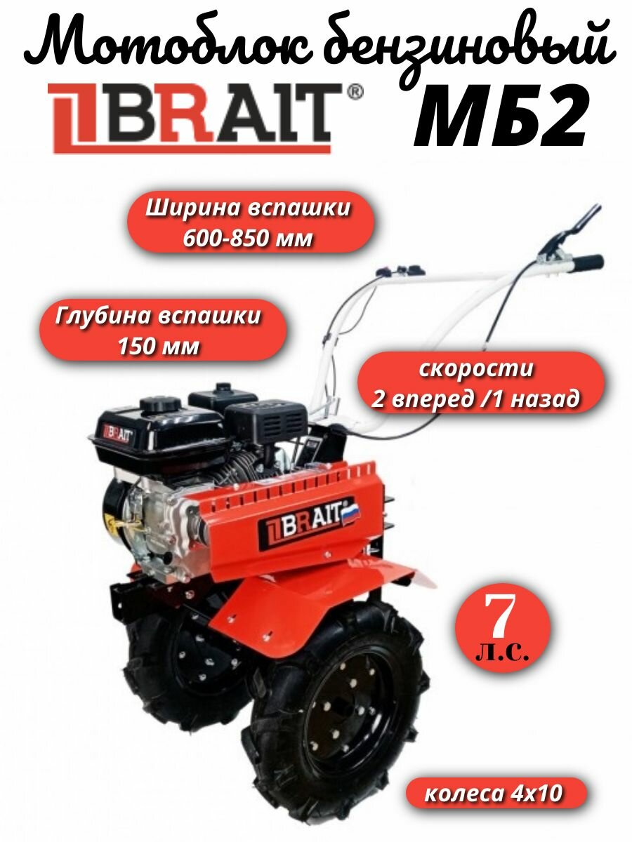 Мотоблок бензиновый BRAIT МБ2 (7л. с, чугун. редуктор; ск: 2 впер/1 наз, регул. руля в 2-х плоск, шир. обр. 850 мм, глуб. обр.150 мм, колеса 4/10) 04.01.112.073 интересное: