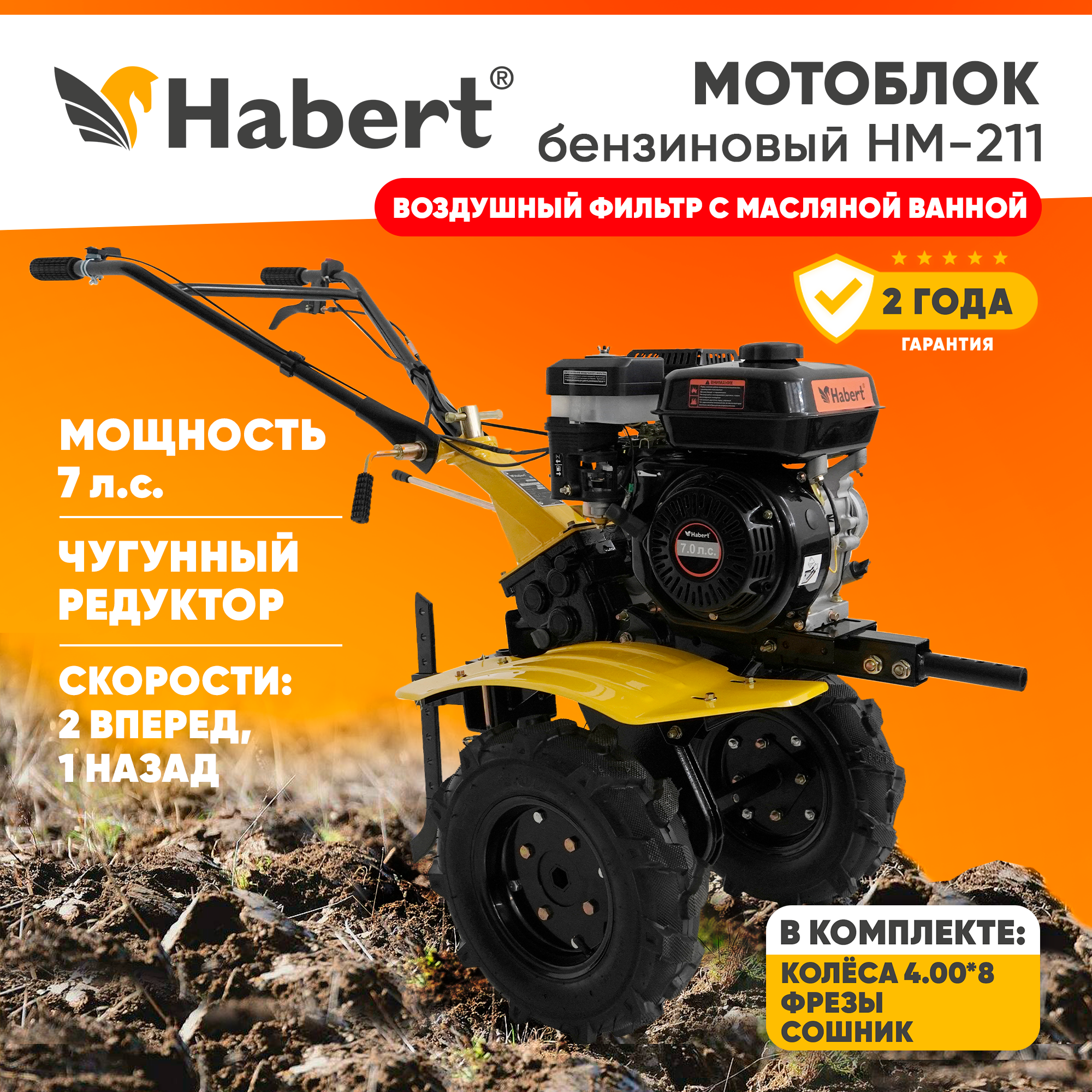 Купить Мотоблок бензиновый Habert HM-211 (HB170F), 7 лс, колеса 4.00*8, КПП 2 вперед 1 назад