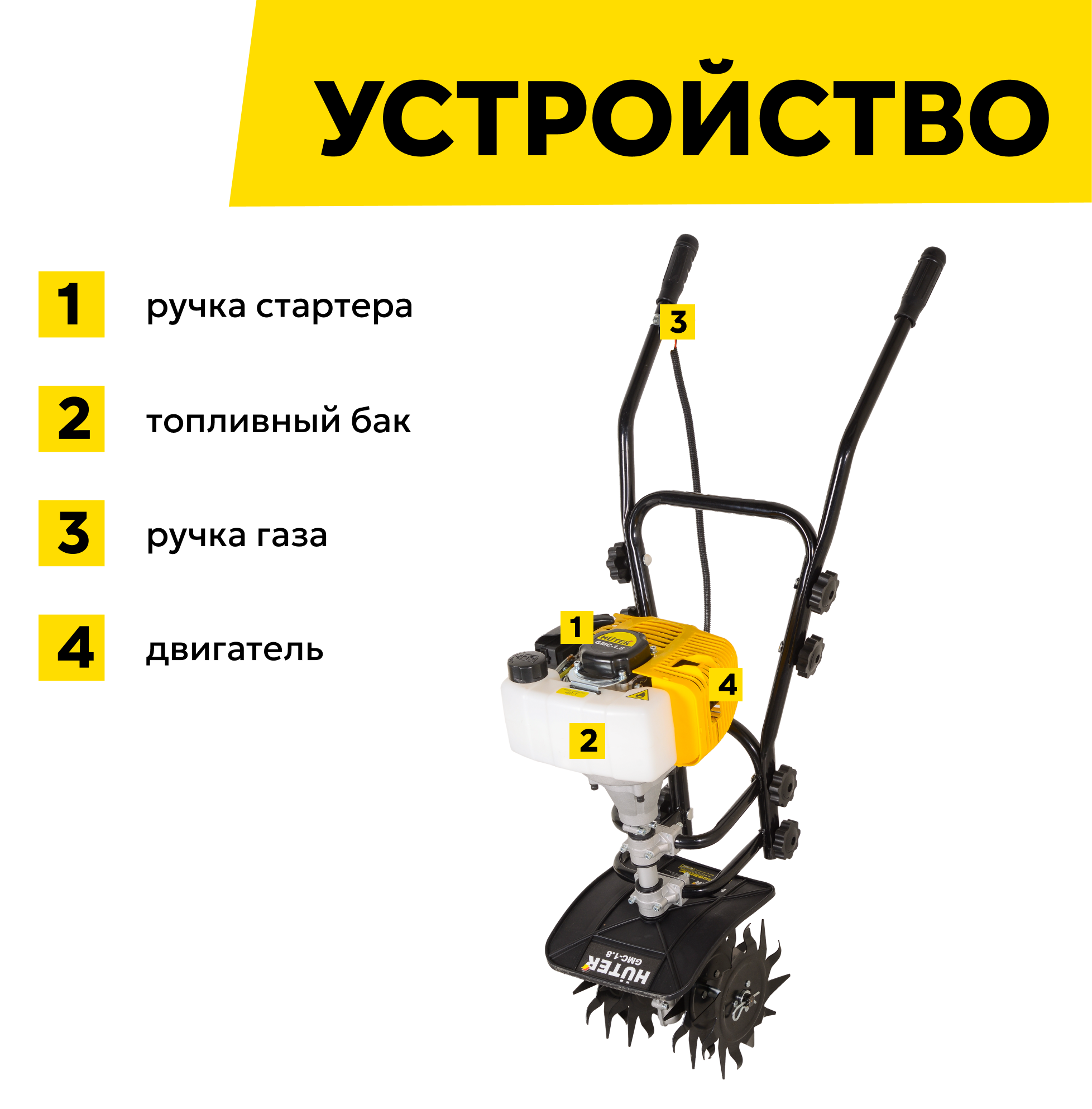 Мотокультиватор бензиновый HUTER GMC-1.8, 1 л. с, двухтактный, бензин, бак - 0.65 л, ширина – 23 см интересное: