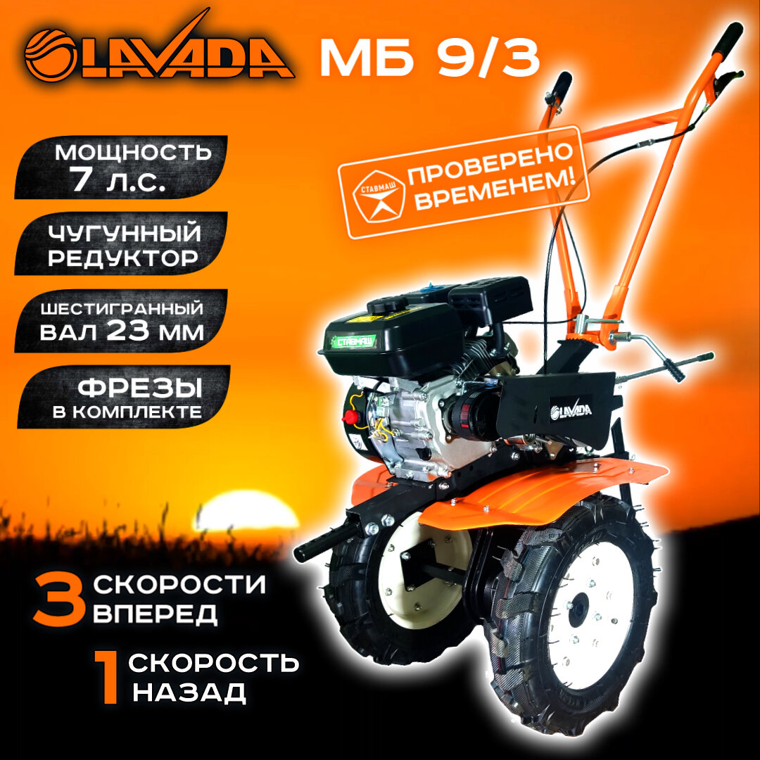 Ниже Вы можете прочитать отзывы на Мотоблок LAVADA МБ-9/3 (7л. с, 3 скор. 1 зад. чугун. редуктор), ознакомится с подробными характеристиками, посмотреть интересные обзоры и фотографии на Мотоблок LAVADA МБ-9/3 (7л. с, 3 скор. 1 зад. чугун. редуктор).