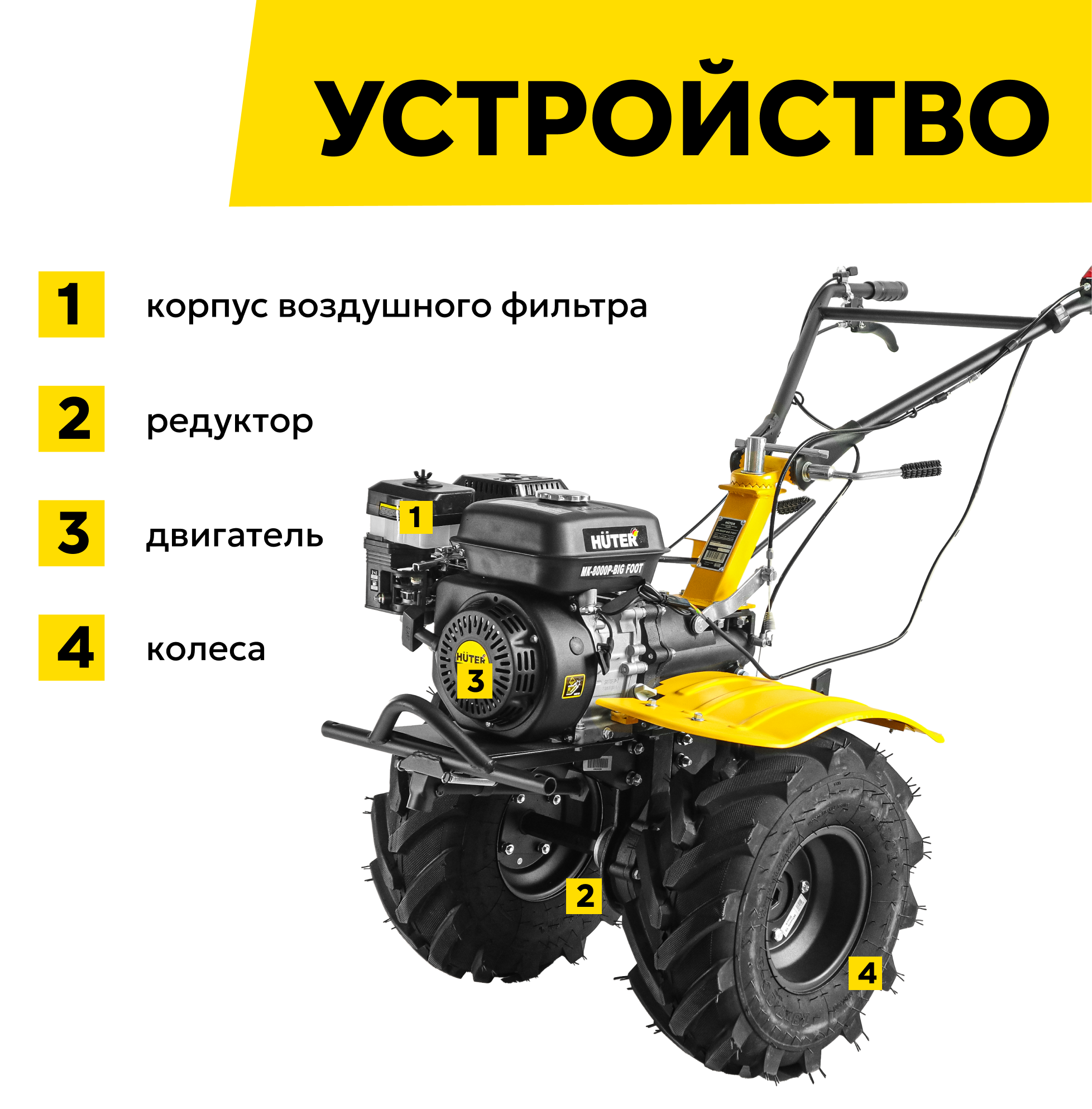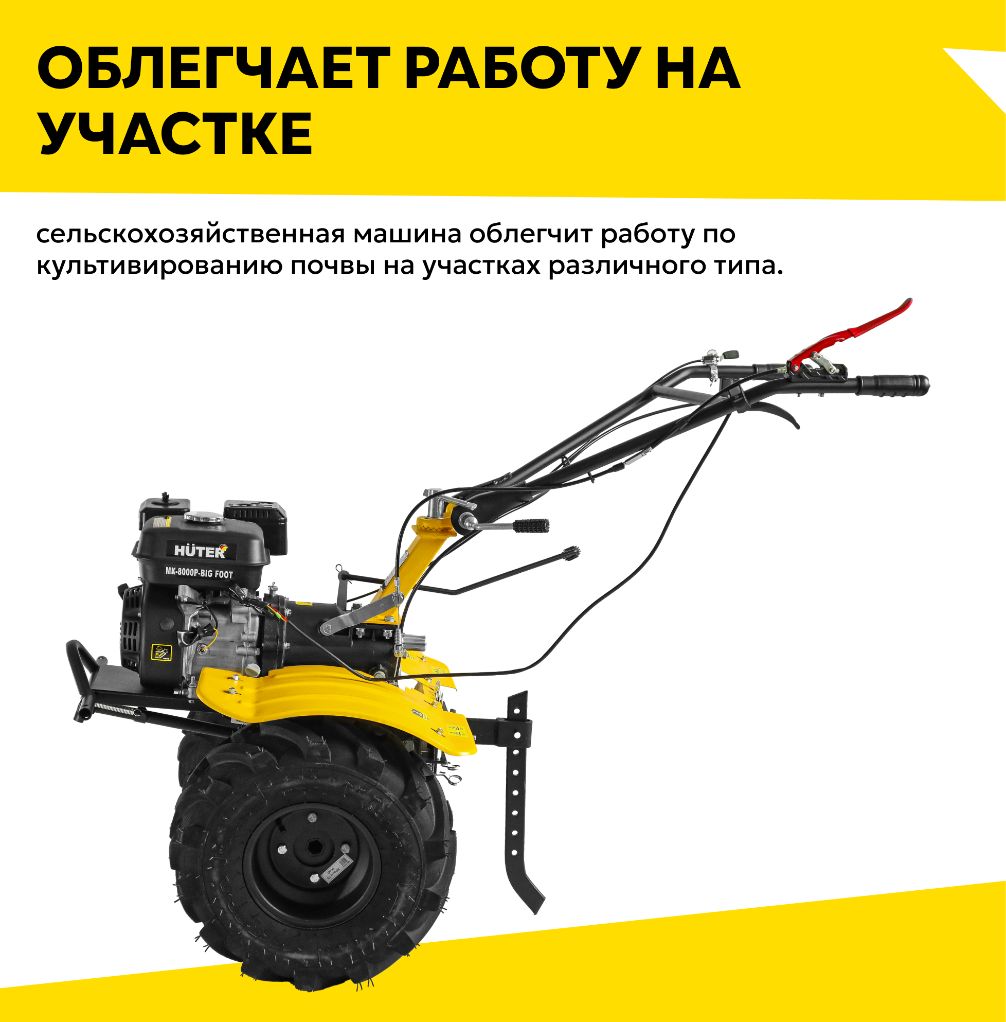 Сельскохозяйственная машина HUTER МК-8000P BIG FOOT, 8 л. с, четырехтактный, бензин, бак – 3.6 л, ширина – 100 см интересное: