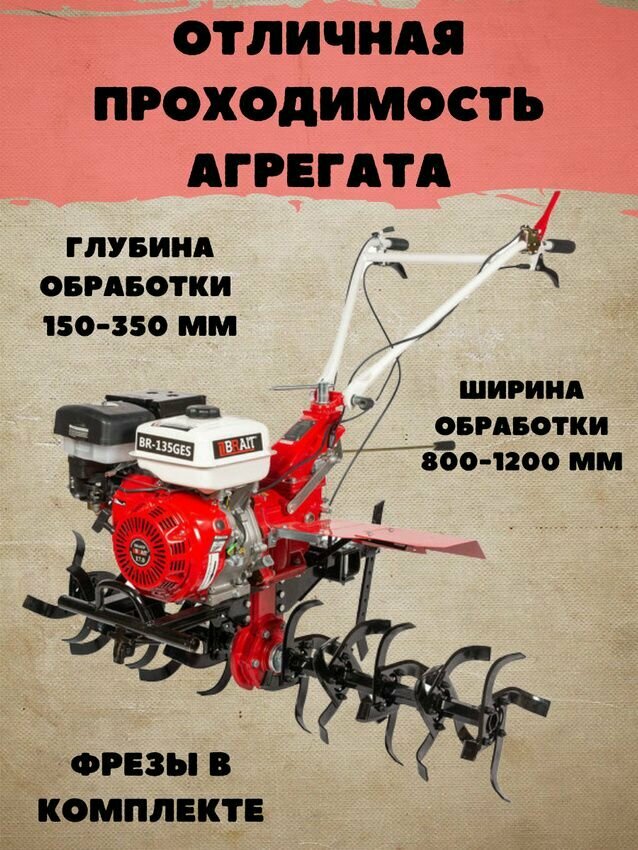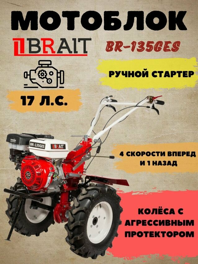 Мотоблок бензиновый BRAIT BR-135GES (17 л. с. 4 скорости вперед и 1 назад, глубина обработки 150-350 мм, ручной запуск) / мотокультиватор интересное: