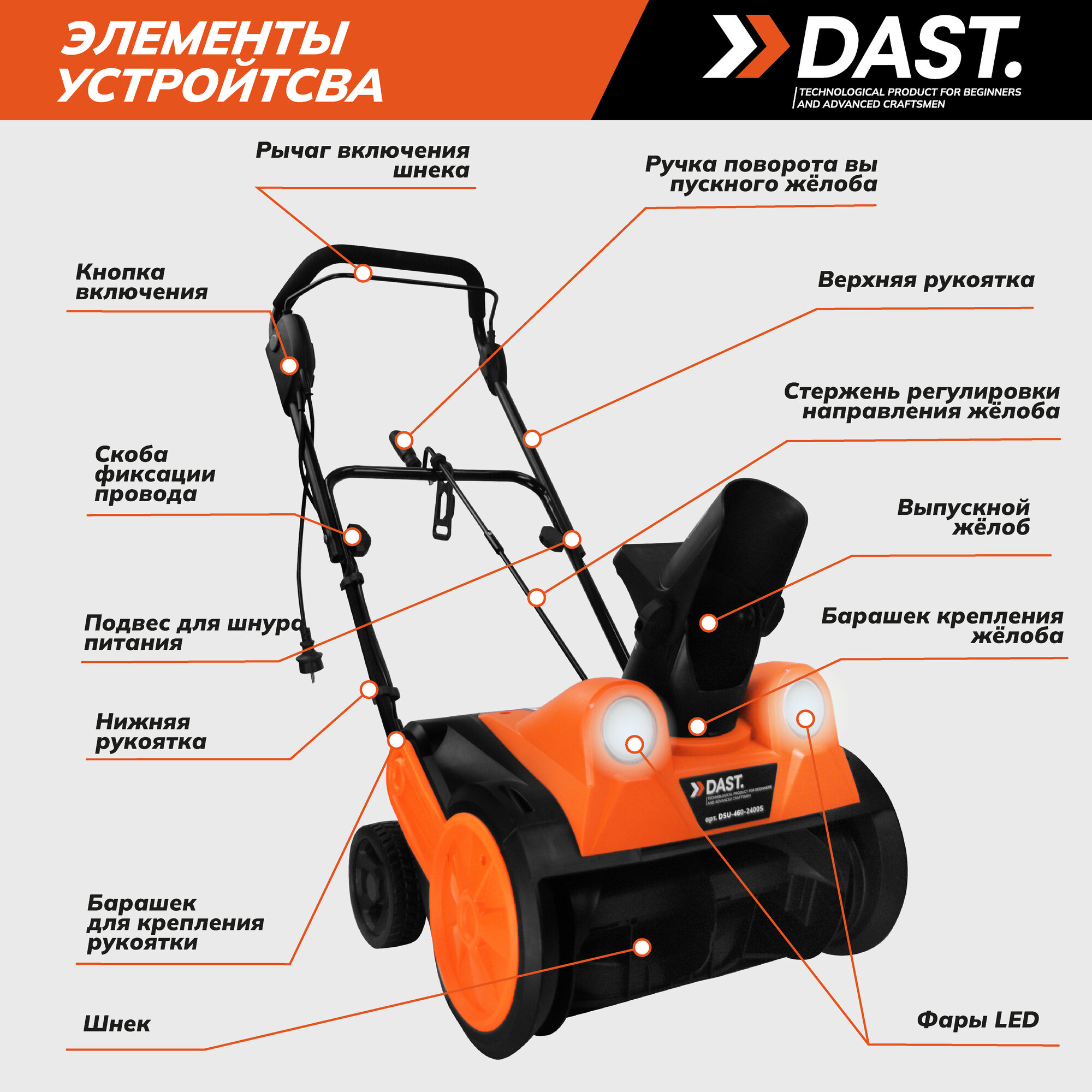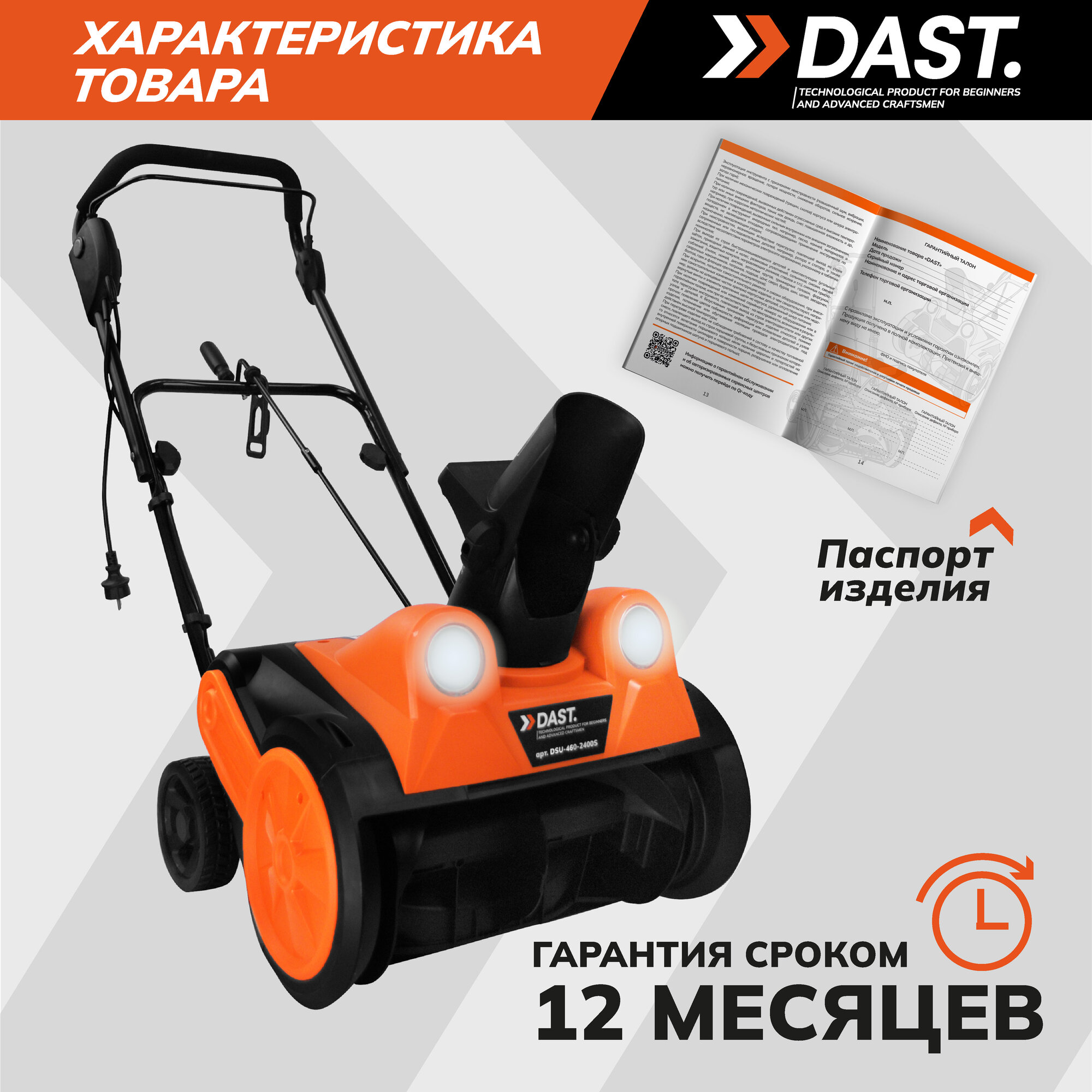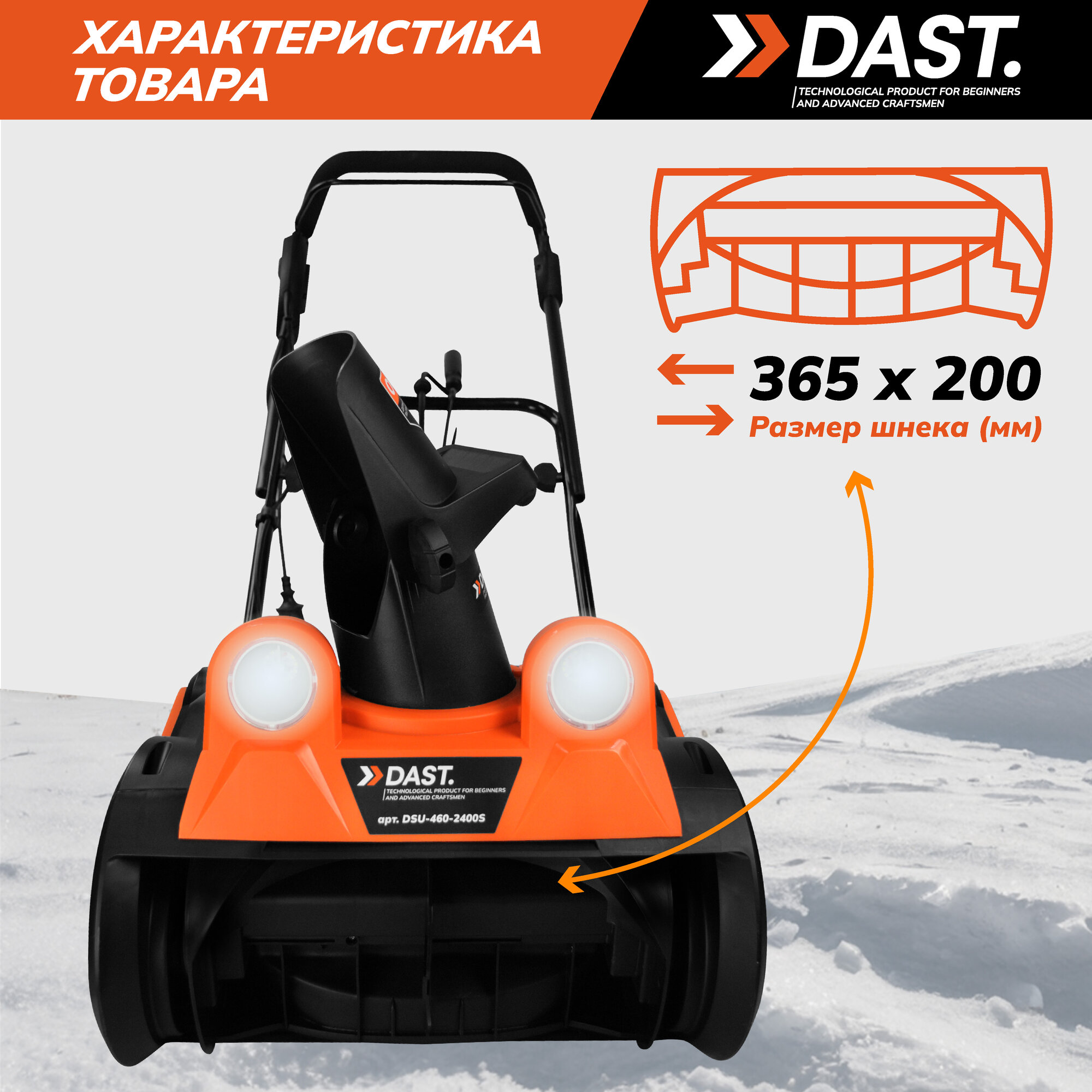 Снегоуборщик электрический DAST 2400 Вт, широкий ковш 46 см. с фарами, 3200 об/мин, ременной привод интересное: