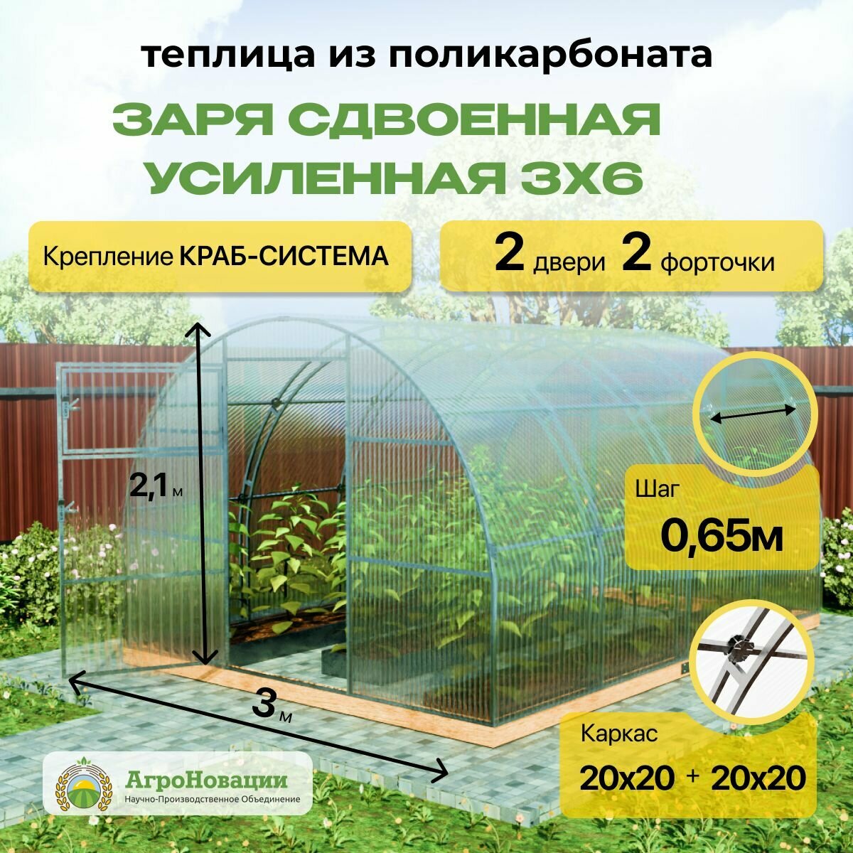 Купить Теплица "Сдвоенная Усиленная" 3х6, шаг между дугами 65 см с поликарбонатом 4мм, цельные дуги 20х20+20х20, краб - система крепежа