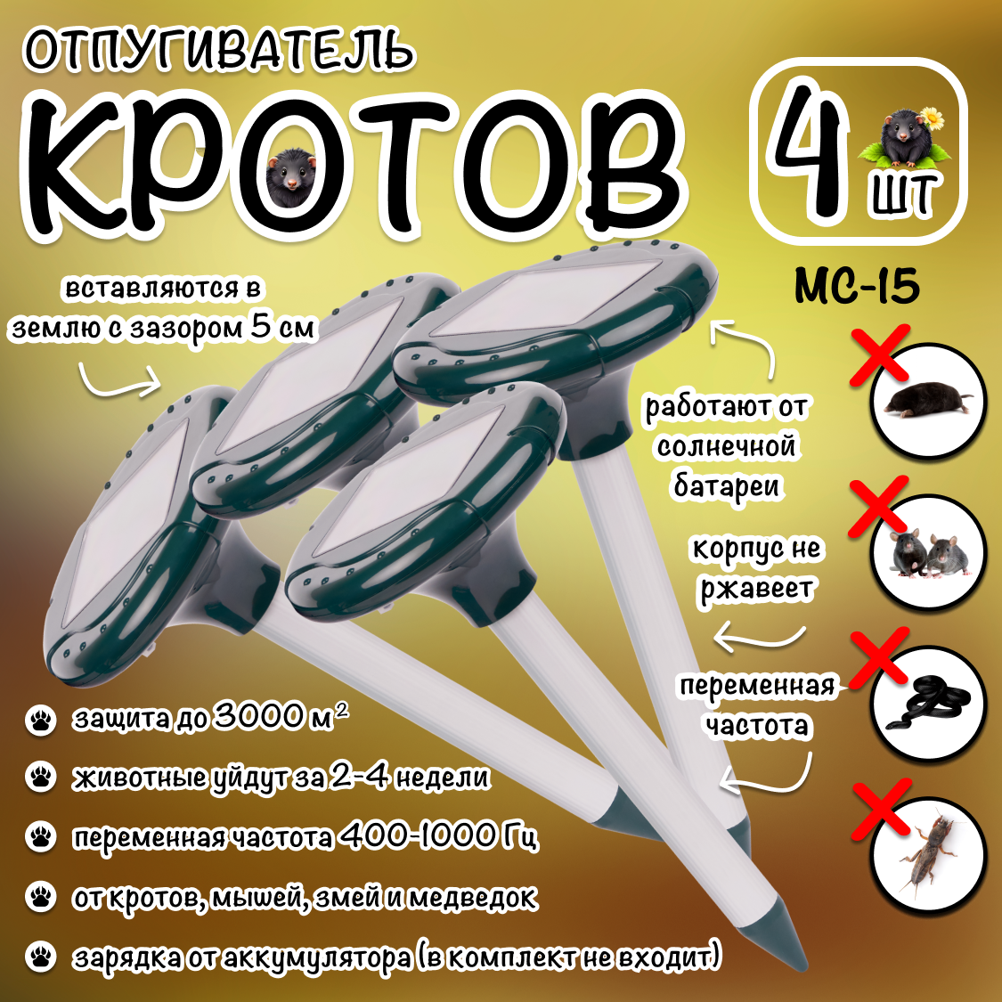 Отпугиватель кротов, мышей, землероек, грызунов, на солнечной батарее, MC-15, Планета садовод, 4 штуки интересное: