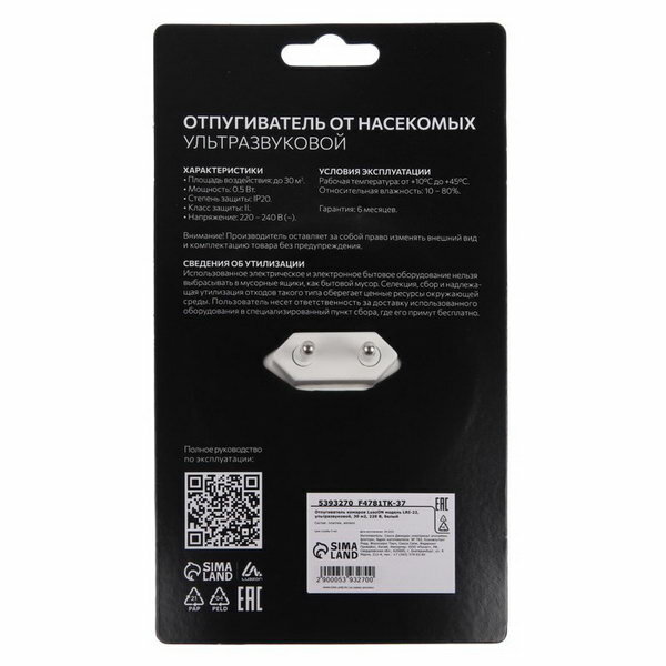 Отпугиватель комаров Luazon LRI-22, ультразвуковой, 30 м2, 220 В, белый интересное: