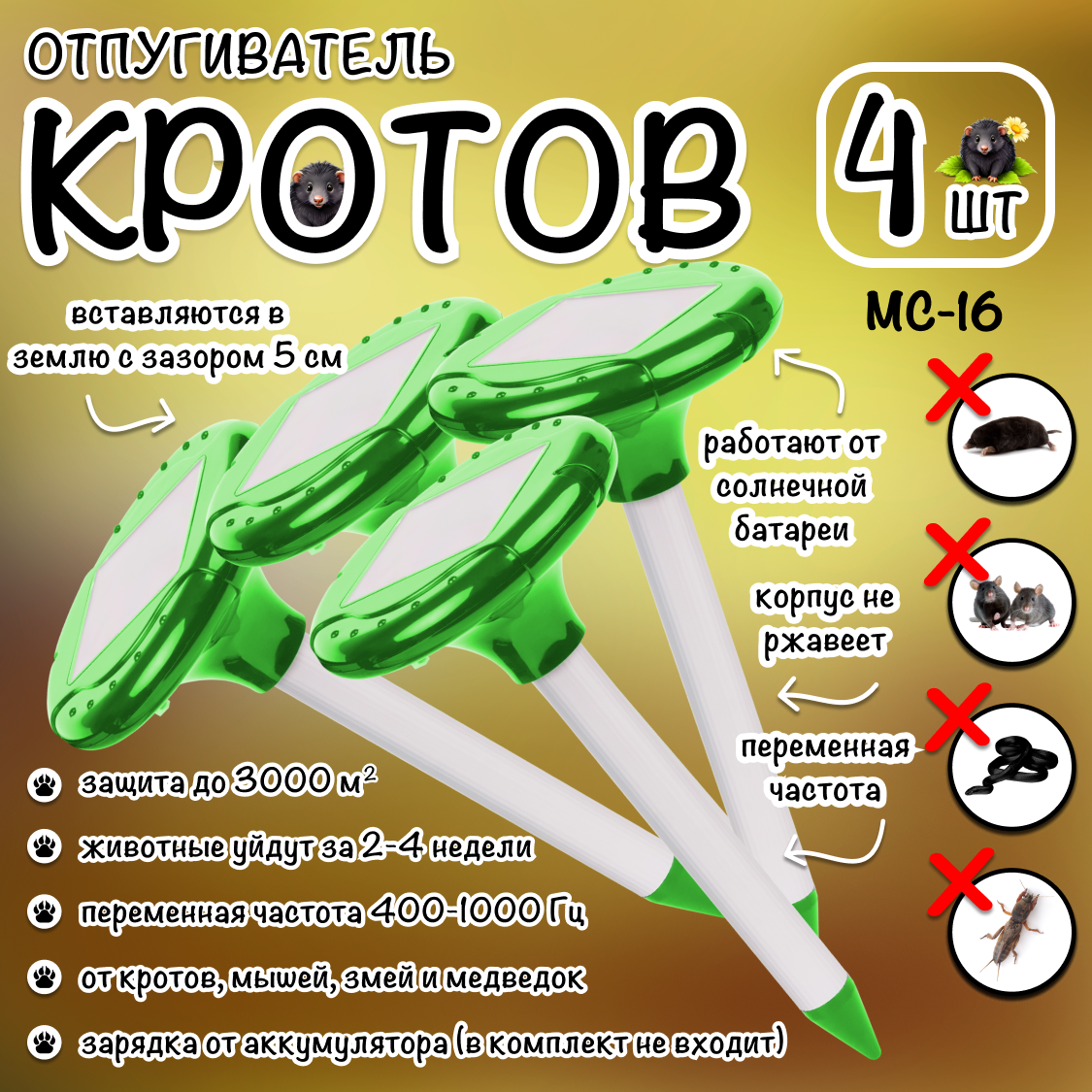Отпугиватель кротов, мышей, землероек, грызунов, на солнечной батарее с подсветкой, МС- 16, Планета Садовод, 4 штуки интересное: