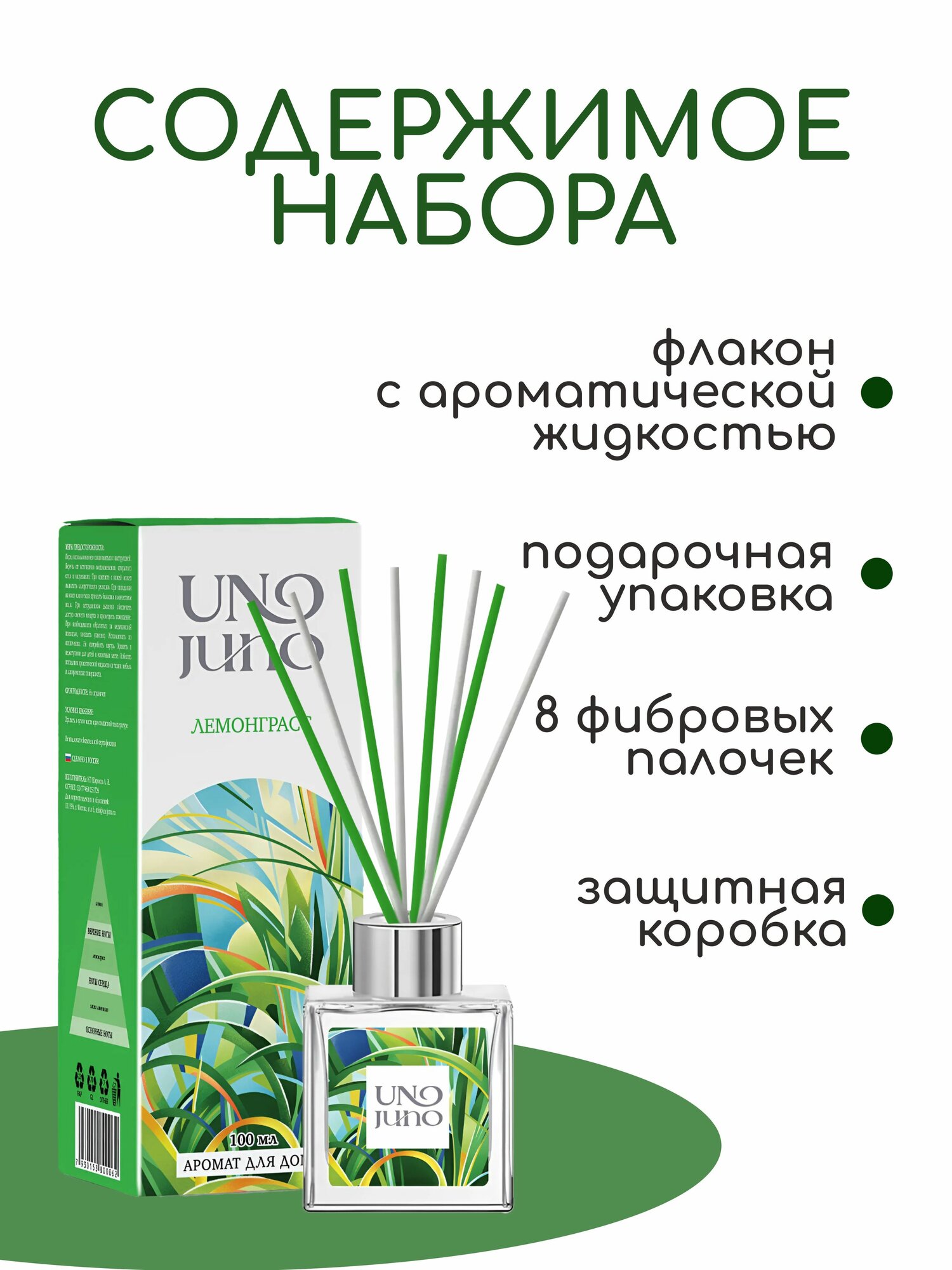 Купить Аромадиффузор UnoJuno "Лемонграсс", 100 мл, жидкость, 8 палочек в комплекте