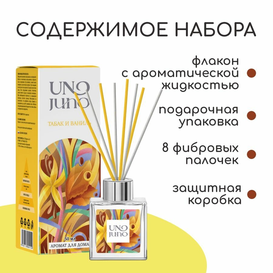 Купить Аромадиффузор UnoJuno "Табак и Ваниль", 50 мл, жидкость, 8 палочек в комплекте