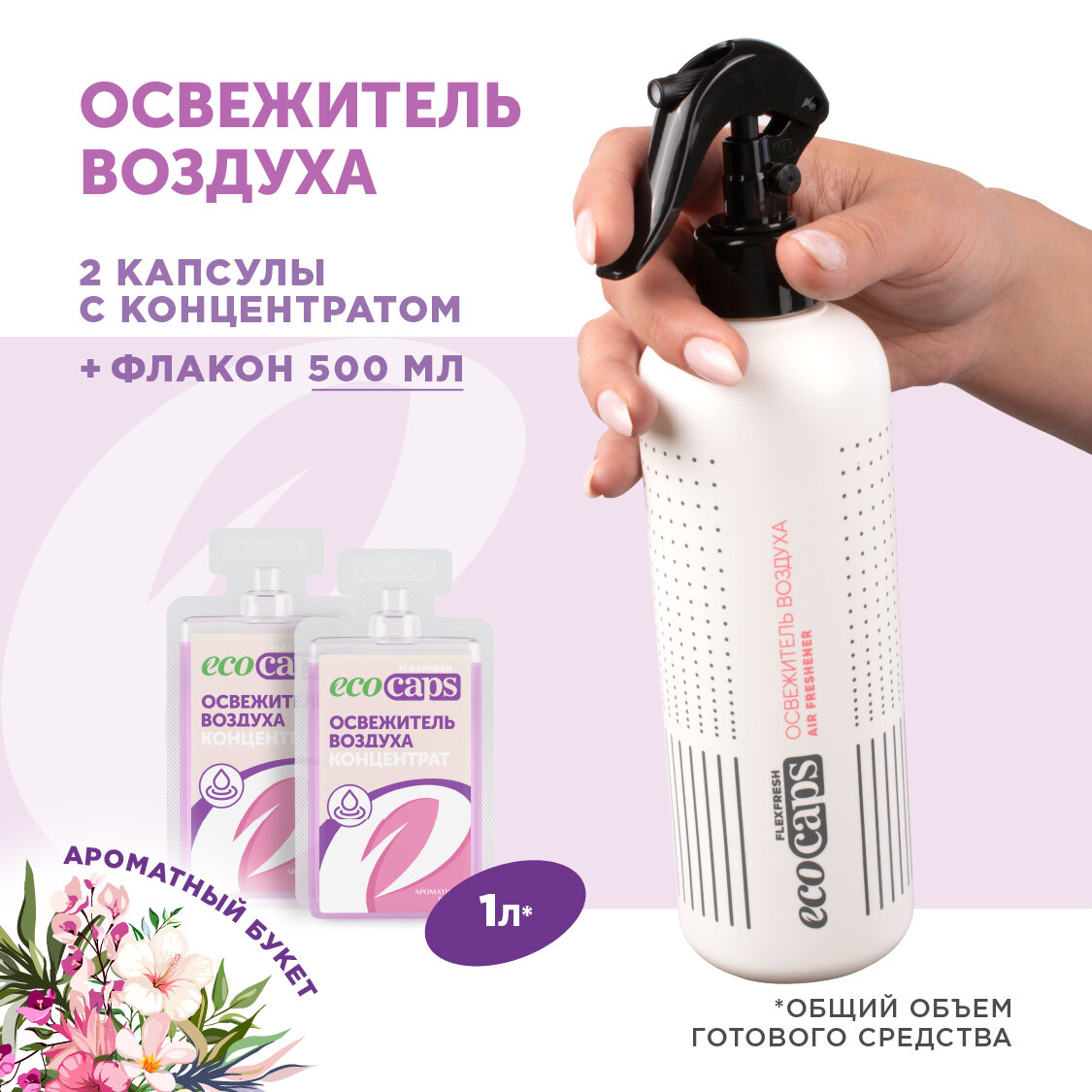 Освежитель воздуха EcoCaps (концентрат для разведения водой) 2 шт по 50 мл + белый флакон, аромат Ароматный букет интересное: