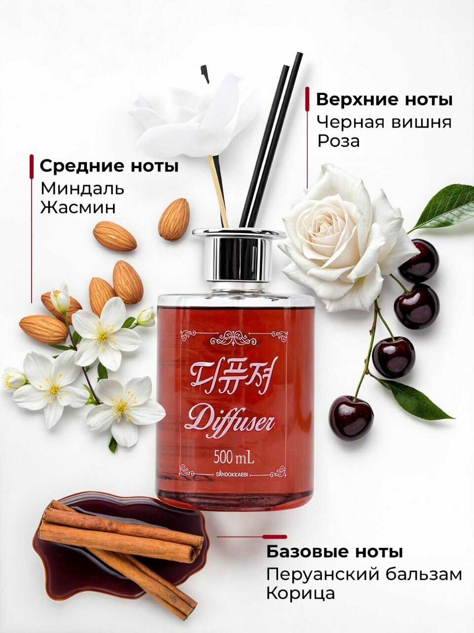 Купить Ароматизатор диффузор для дома с палочками Sandokkaebi с ароматом кисло-сладкой и свежей черной вишни в стеклянном флаконе, 500 мл