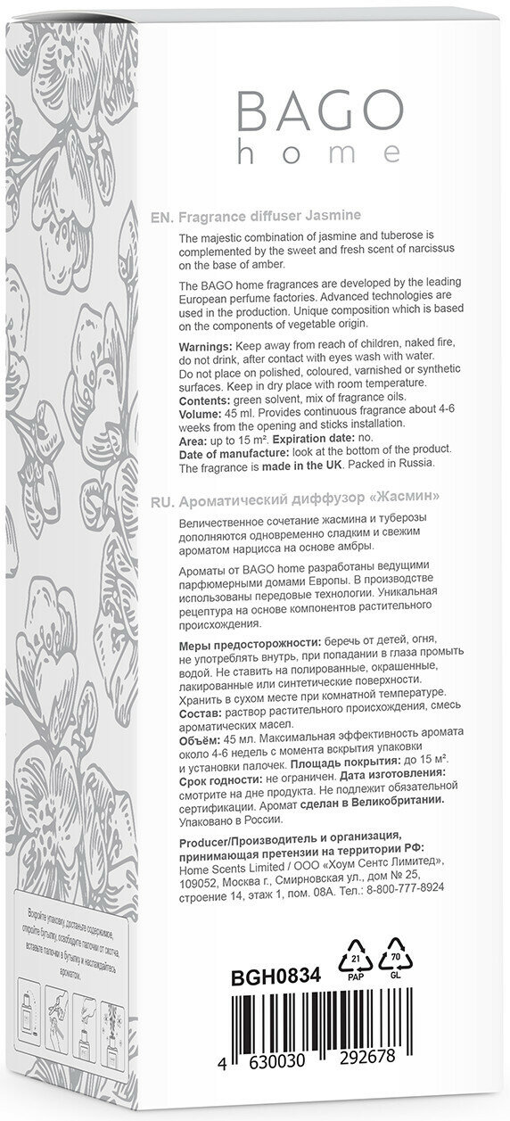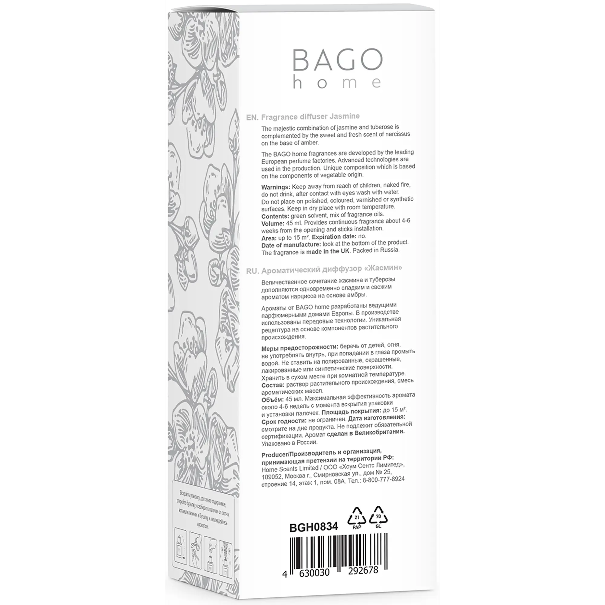 Ароматический диффузор Bago home Жасмин 45 мл, без спирта, Россия