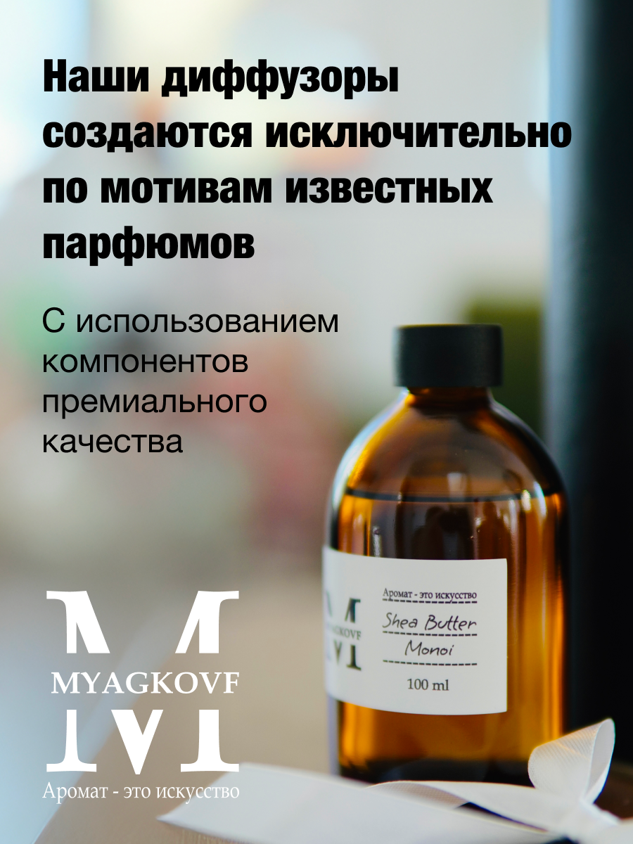 СохранитьАроматический диффузор с палочками / ароматизатор для дома MYAGKOVF "Shea butter Monoi" 100 мл интересное: