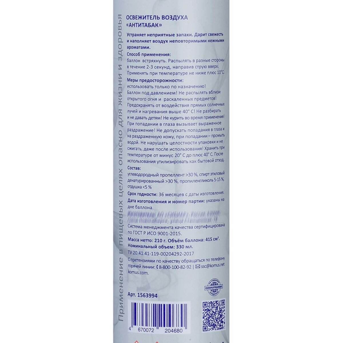 Освежитель воздуха Luscan 330мл Антитабак сухое распыл
