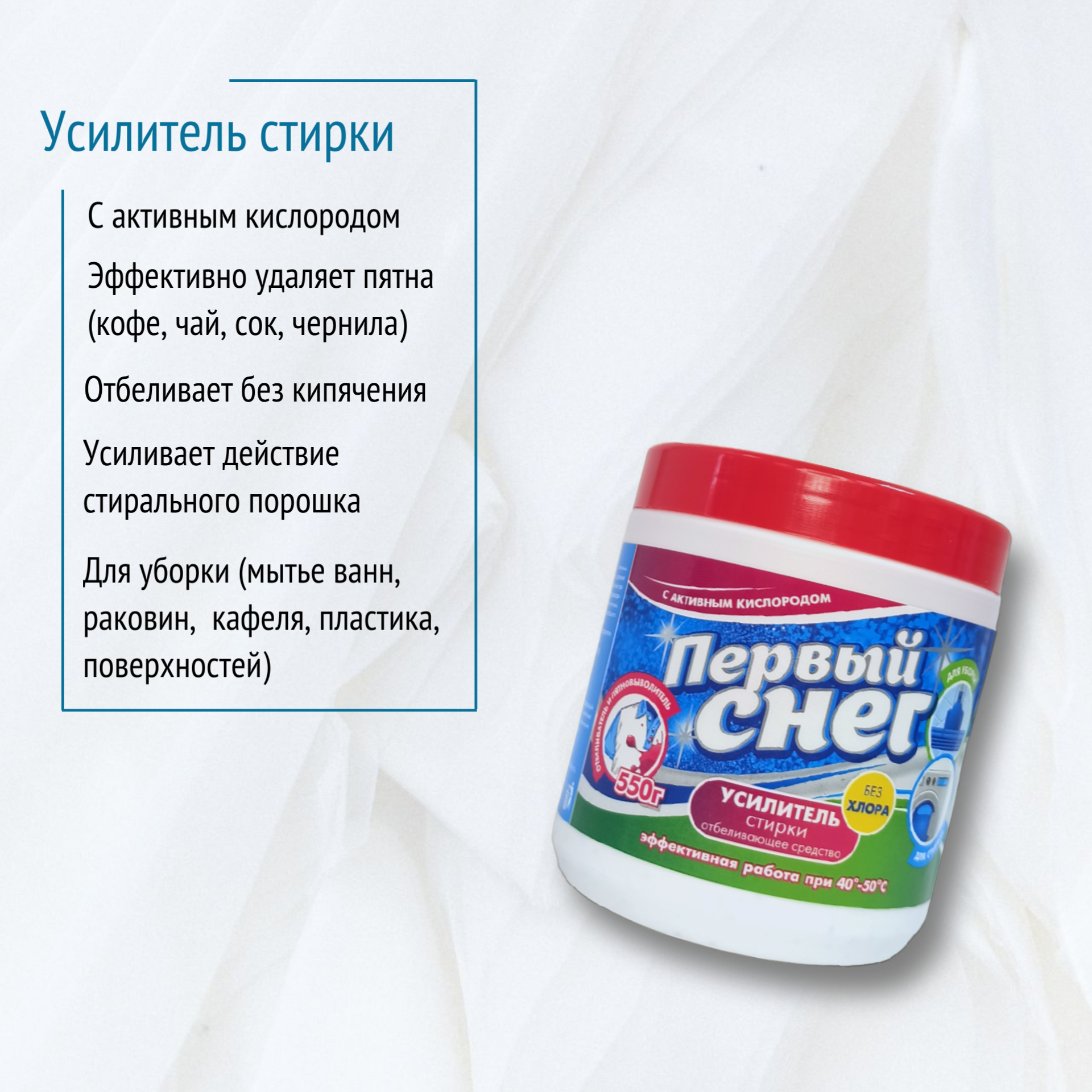 Кислородосодержащий Отбеливатель Пятновыводитель Усилитель стирки "Первый снег", порошок, 550гр. интересное: