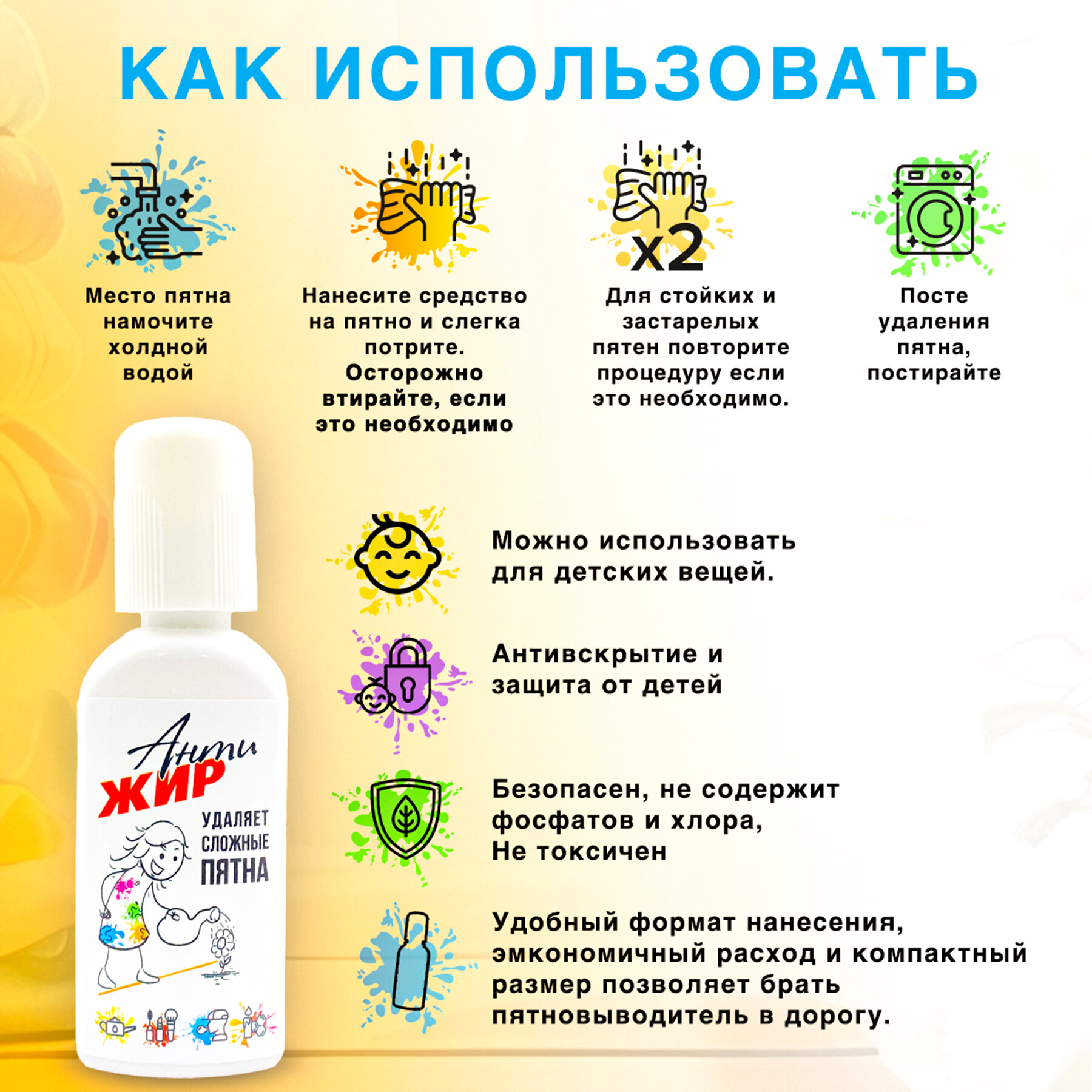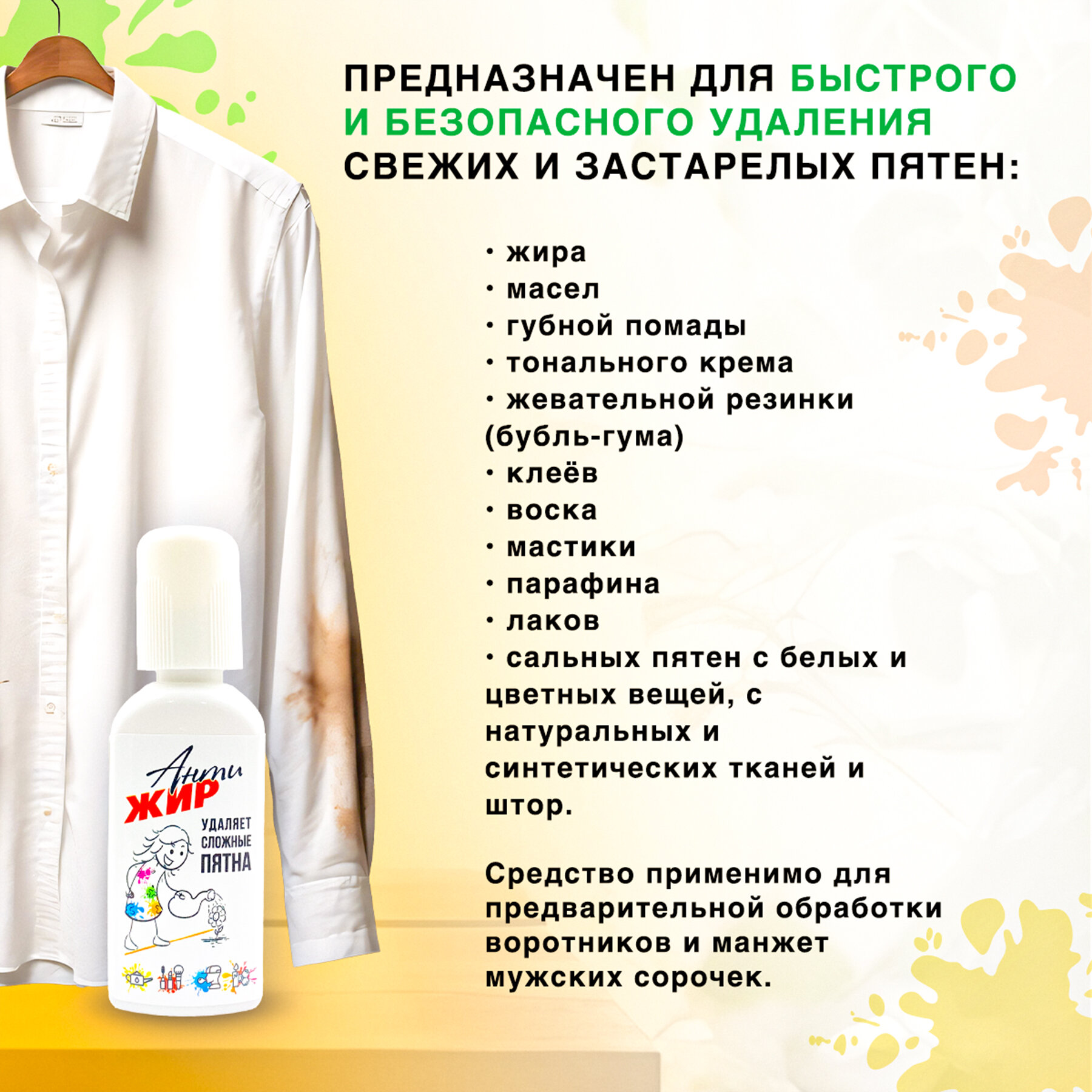 Пятновыводитель Анти Жир для удаления сложных пятен жира, масел, губной помады, жевательной резинки, клеёв, воска, лаков. интересное: