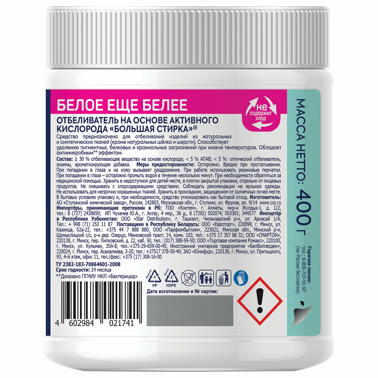 Пятновыводитель-отбеливатель кислородный для белого 400 г, большая стирка, 26456 интересное: