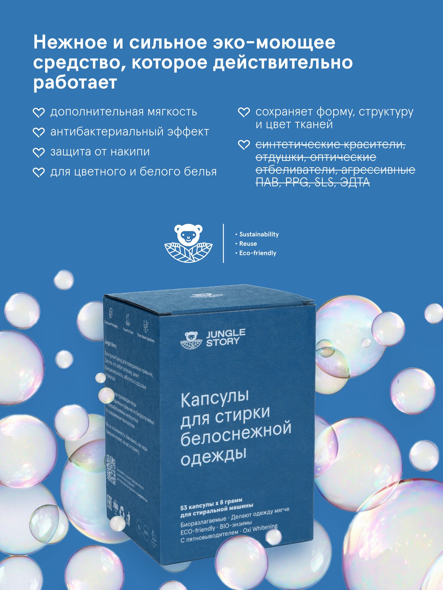 СохранитьЭко-капсулы Jungle Story "Oxi White", для белого белья, биоразлагаемые, гипоаллергенные, 53 шт. интересное: