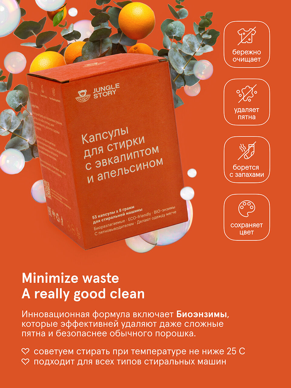 СохранитьКапсулы для стирки Jungle Story Эвкалипт и апельсин, 53 капсулы интересное: