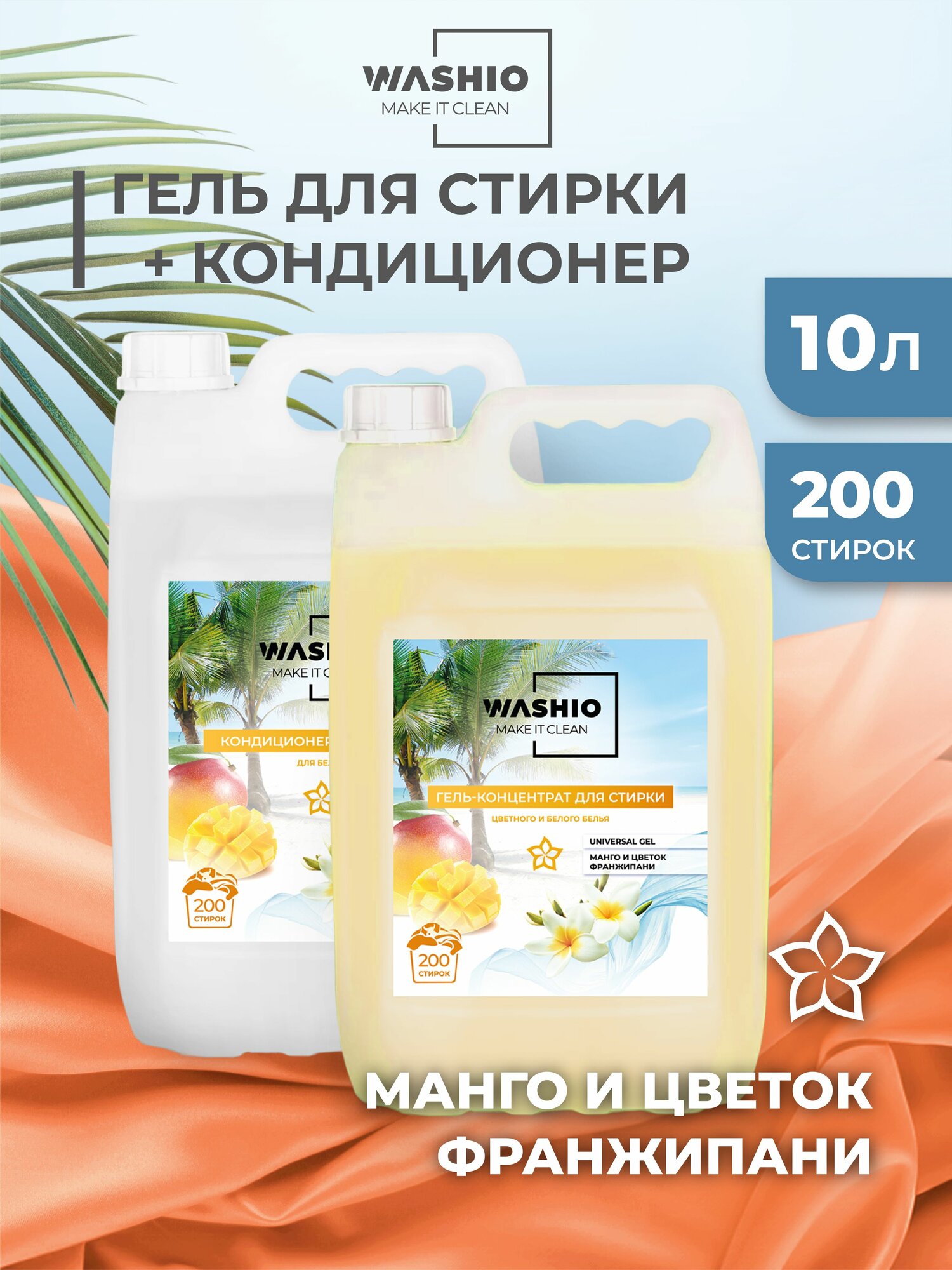 Гель-концентрат для стирки 5л+Кондиционер для белья 5л WASHIO Манго и цветок Франжипани интересное: