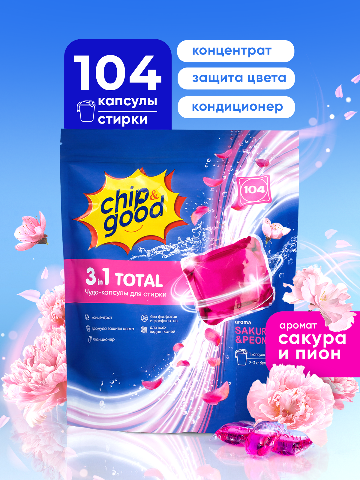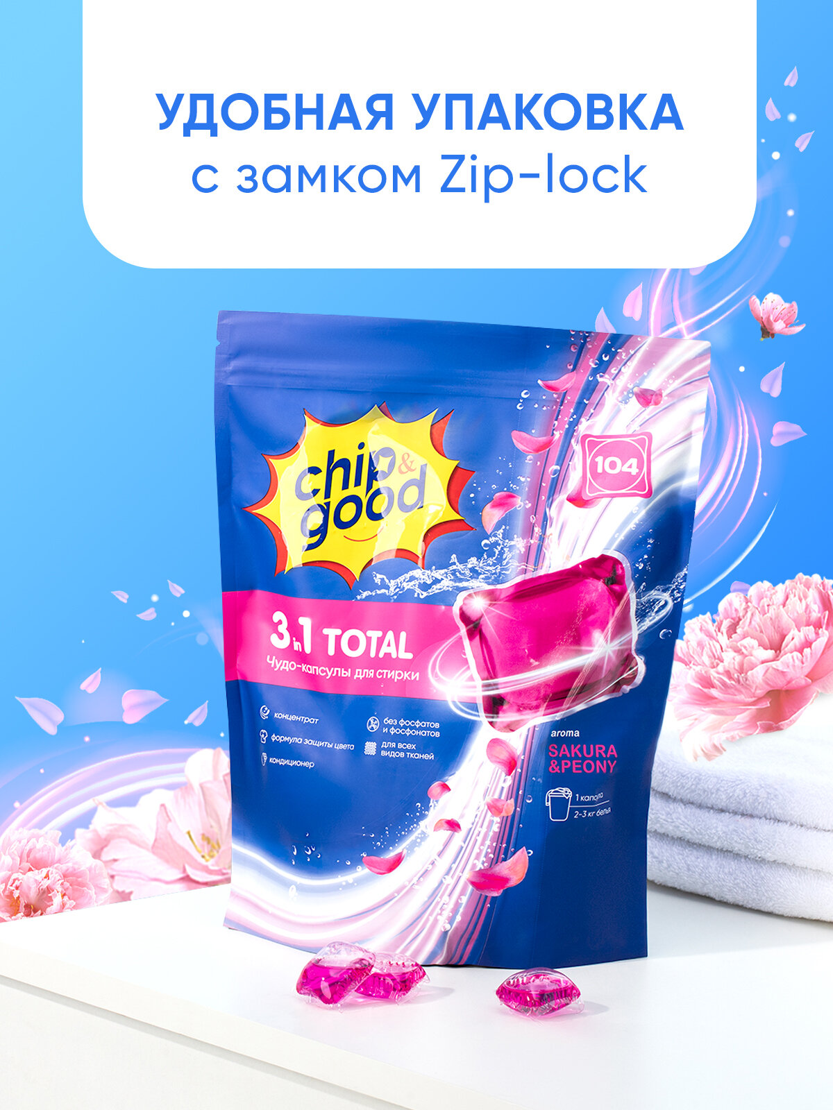 Купить Капсулы для стирки 3в1 zip Chip&Good с энзимами и кондиционером 104 шт, с ароматом сакуры и пиона