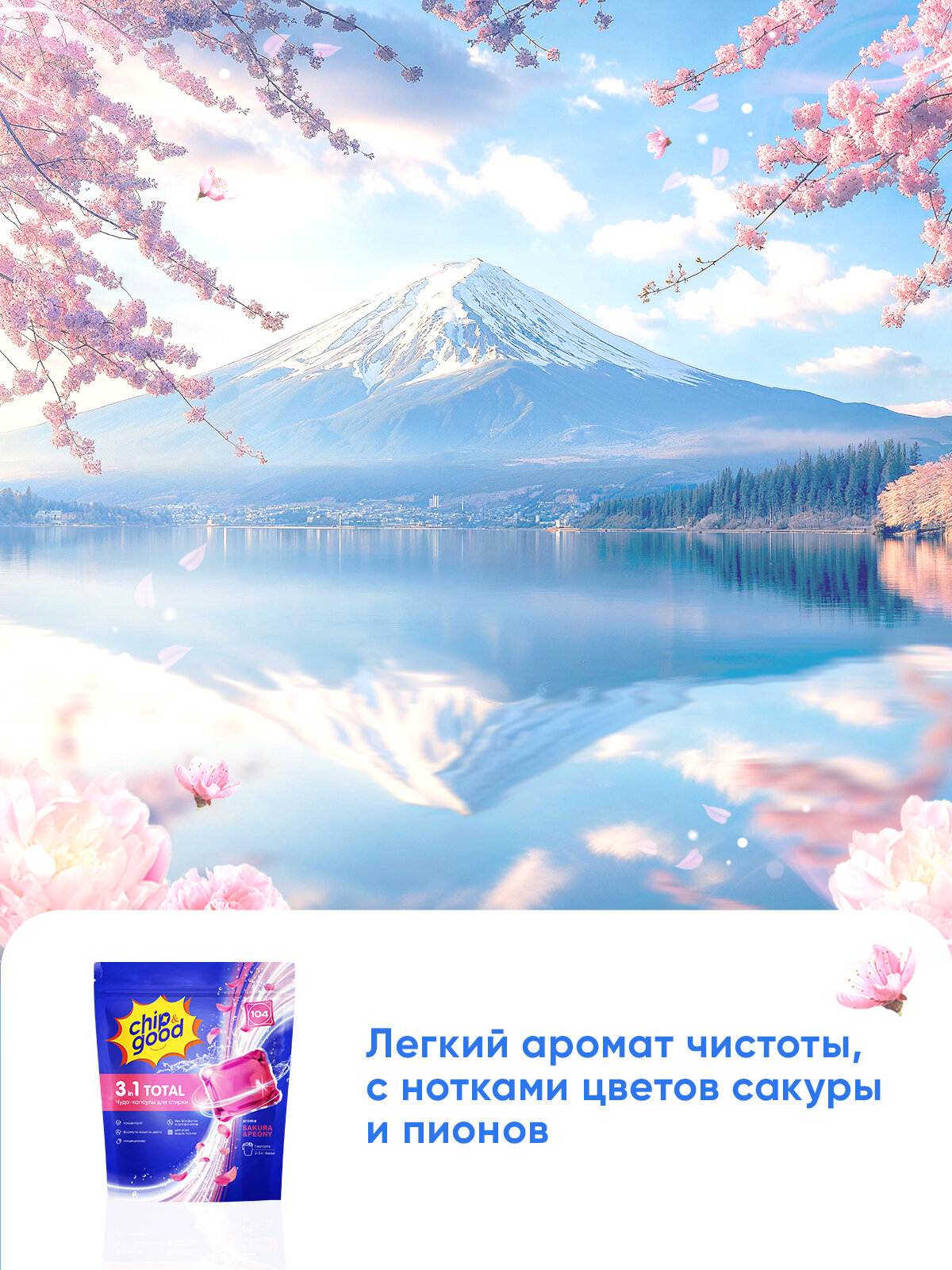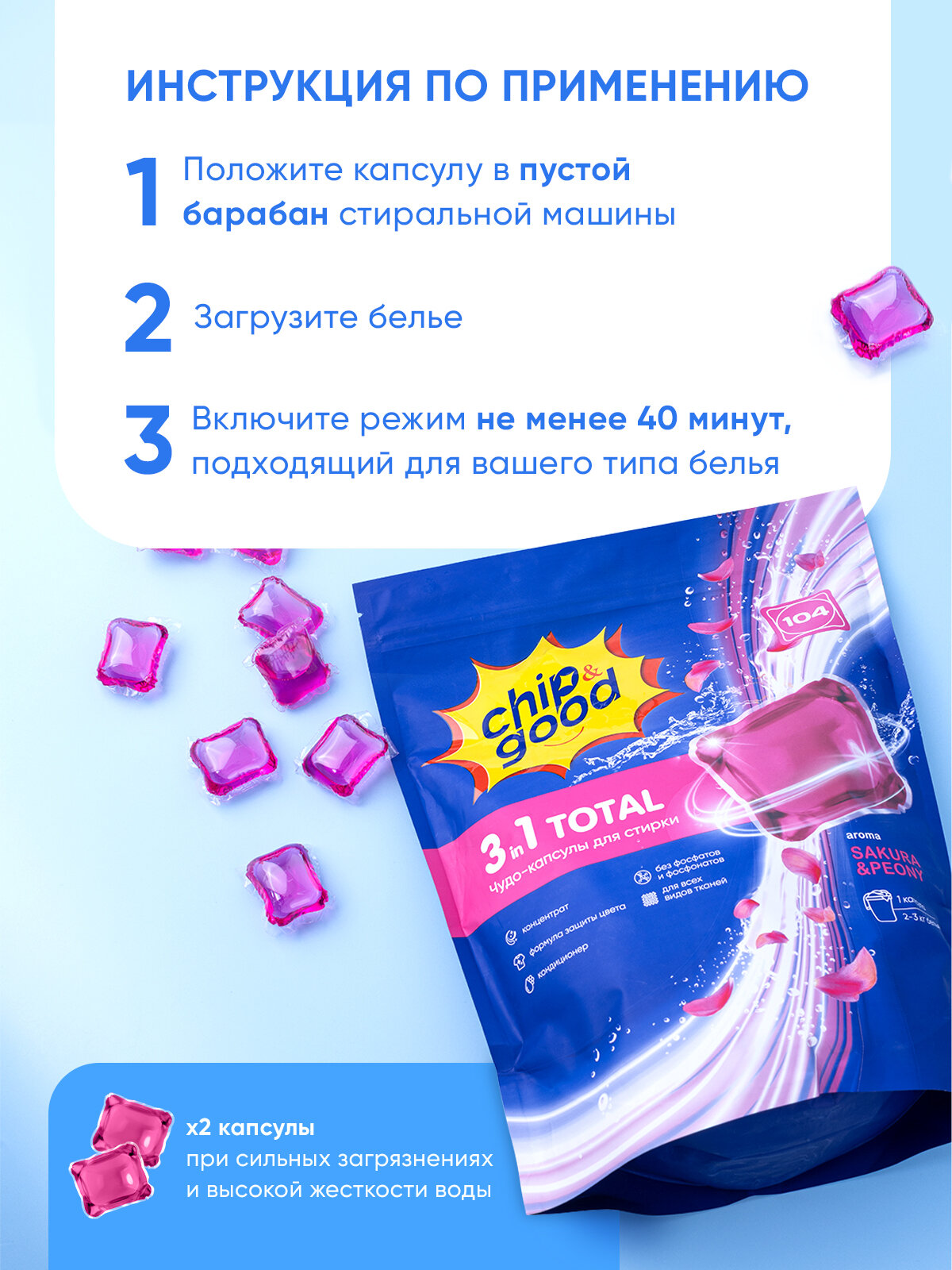СохранитьКапсулы для стирки 3в1 zip Chip&Good с энзимами и кондиционером 104 шт, с ароматом сакуры и пиона интересное: