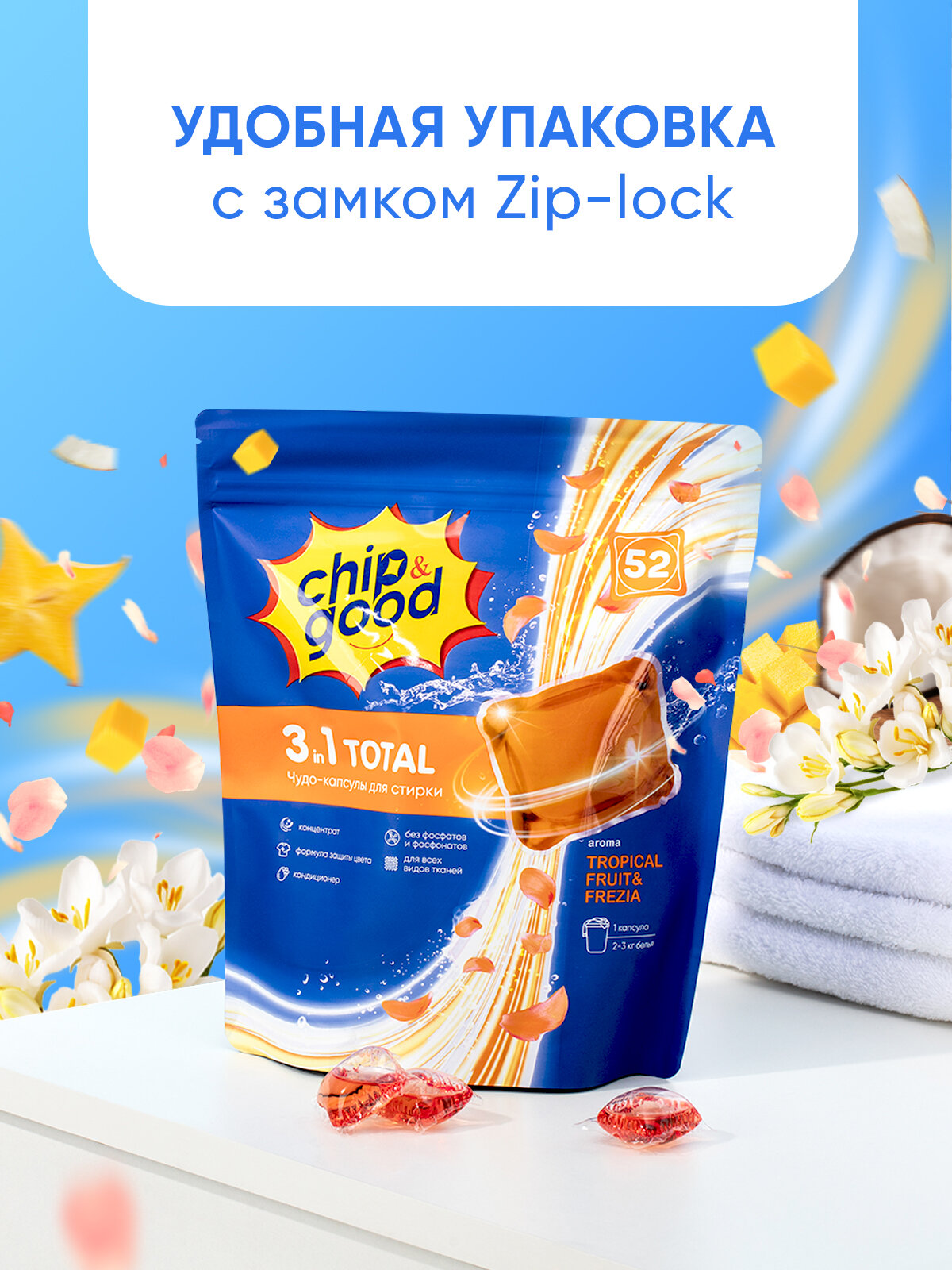 Купить Капсулы для стирки 3в1 zip Chip&Good с энзимами и кондиционером 52 шт, с ароматом тропических фруктов и фрезии
