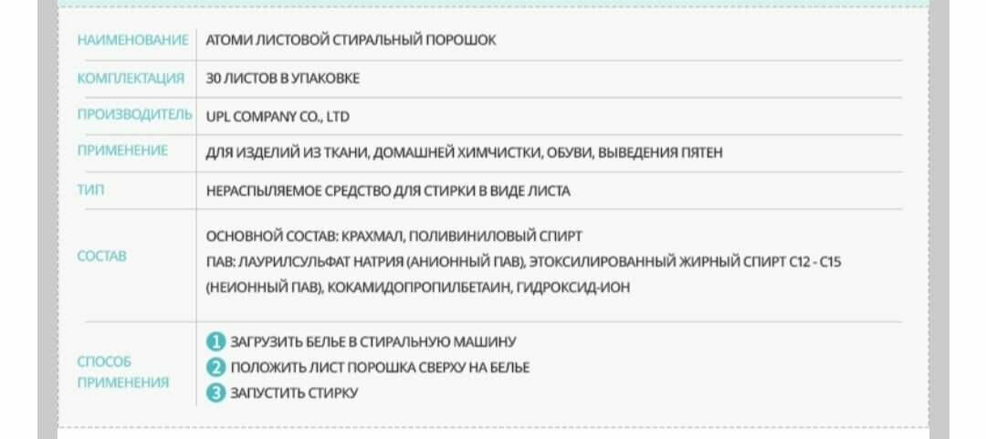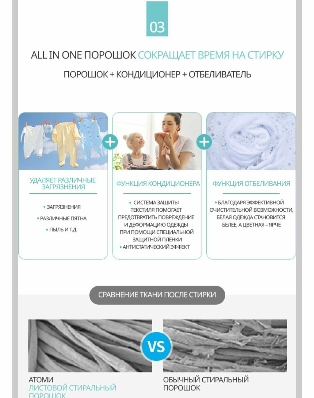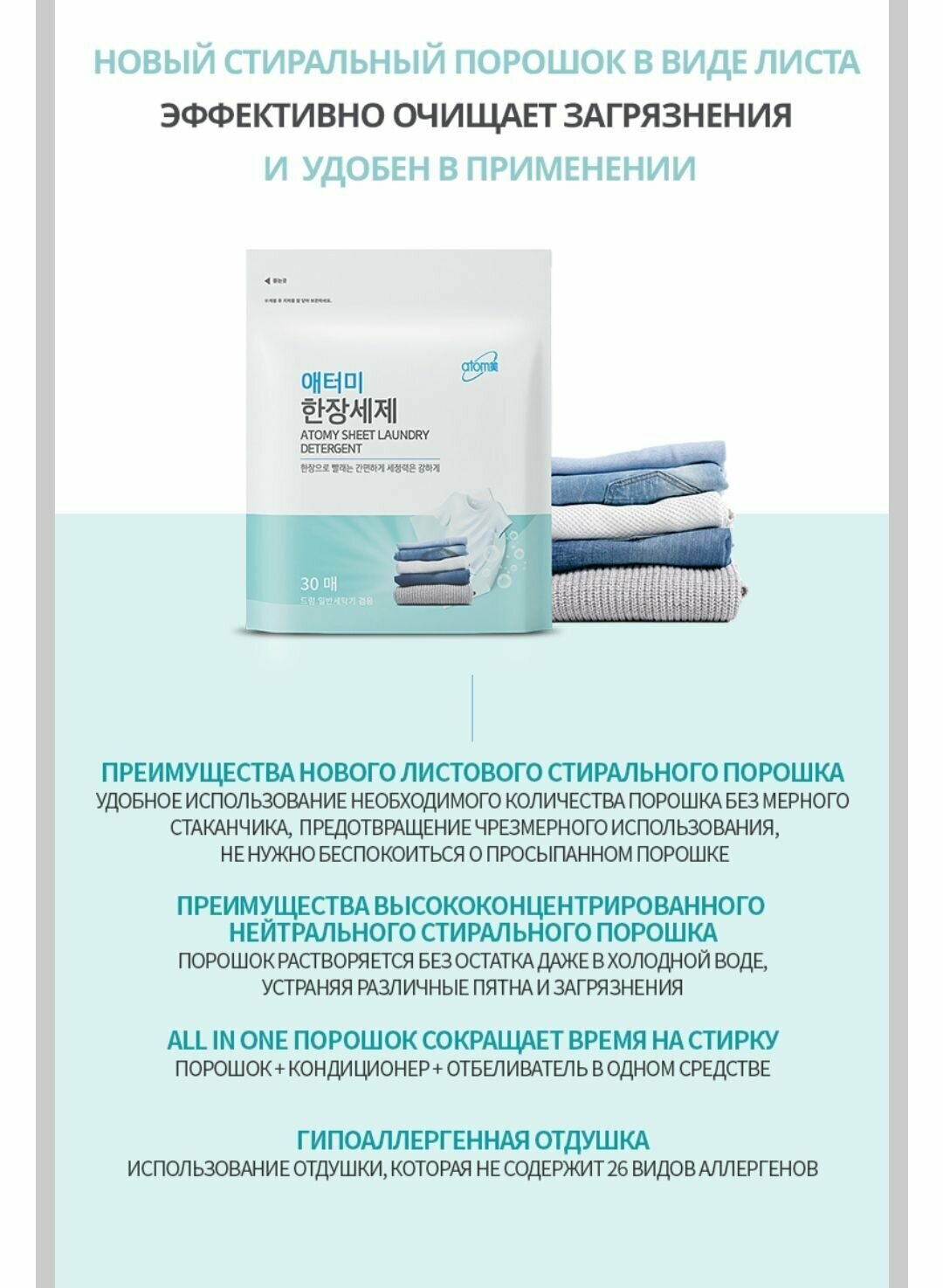 Стиральный порошок Atomy, 30 листов. Срок годности 36 месяцев интересное: