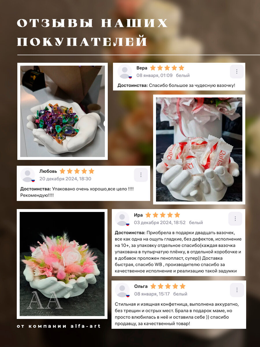 Ниже Вы можете прочитать отзывы на Ваза для мха Руки Давида из гипса / Ваза для конфет мелочей и украшений / Декор на стол, ознакомится с подробными характеристиками, посмотреть интересные обзоры и фотографии на Ваза для мха Руки Давида из гипса / Ваза для конфет мелочей и украшений / Декор на стол.