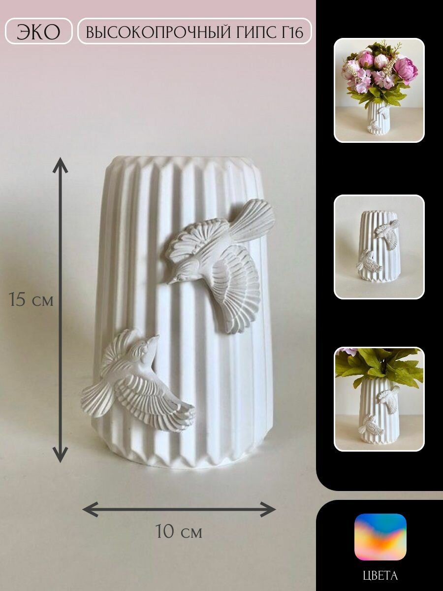 Ваза для сухоцветов, с птичками / из гипса, белая с серебристыми птичками