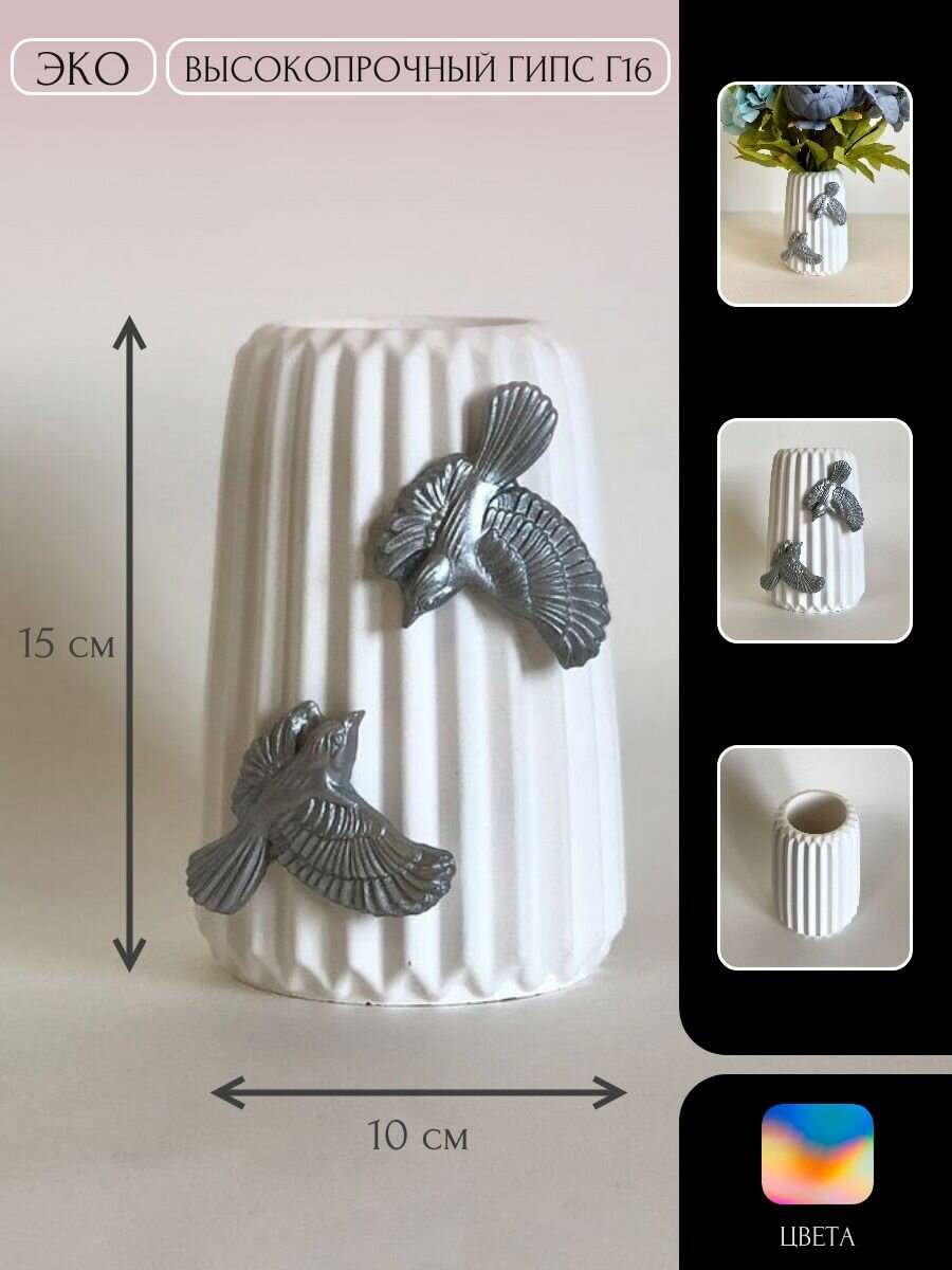 Купить Ваза для сухоцветов, с птичками / из гипса, белая с серебристыми птичками