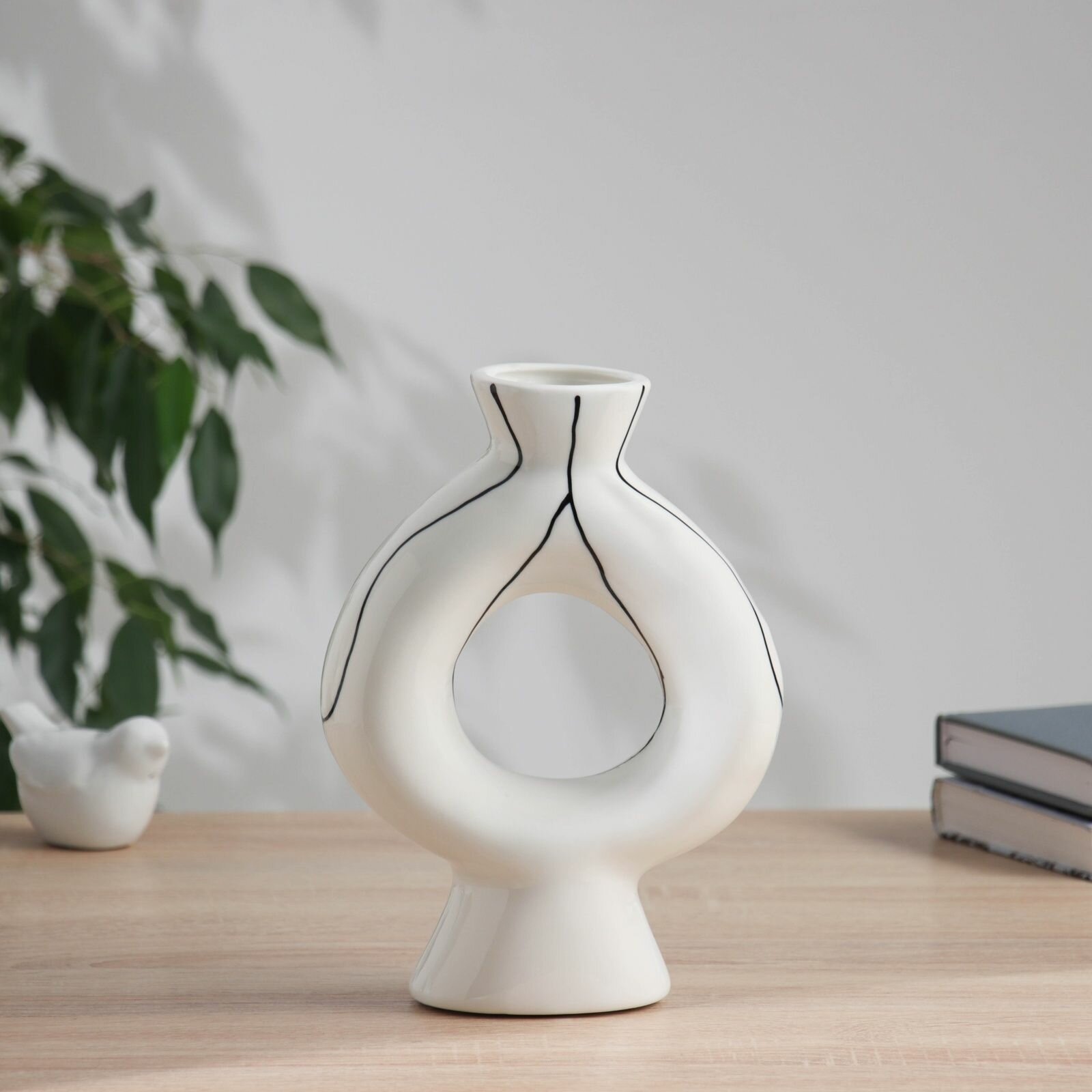 Керамическая ваза декоративная настольная Пикассо (ручная роспись), штрихи грани, для цветов, сухоцветов, 20.5 13 см, чёрно-белый