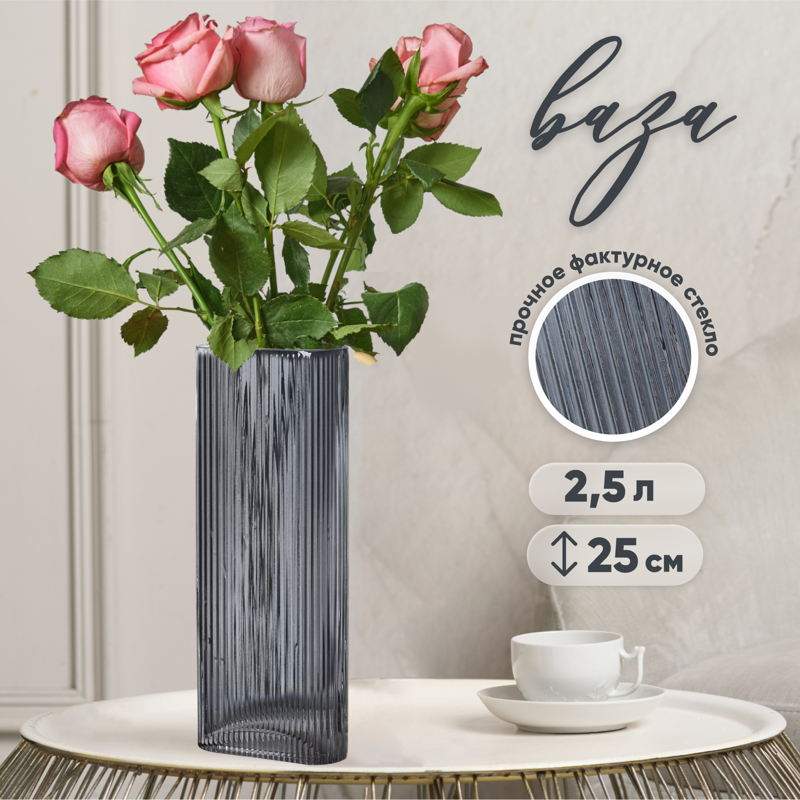 Ваза для цветов и сухоцветов высокая, стеклянная интерьерная 2 л, 27 см, серая