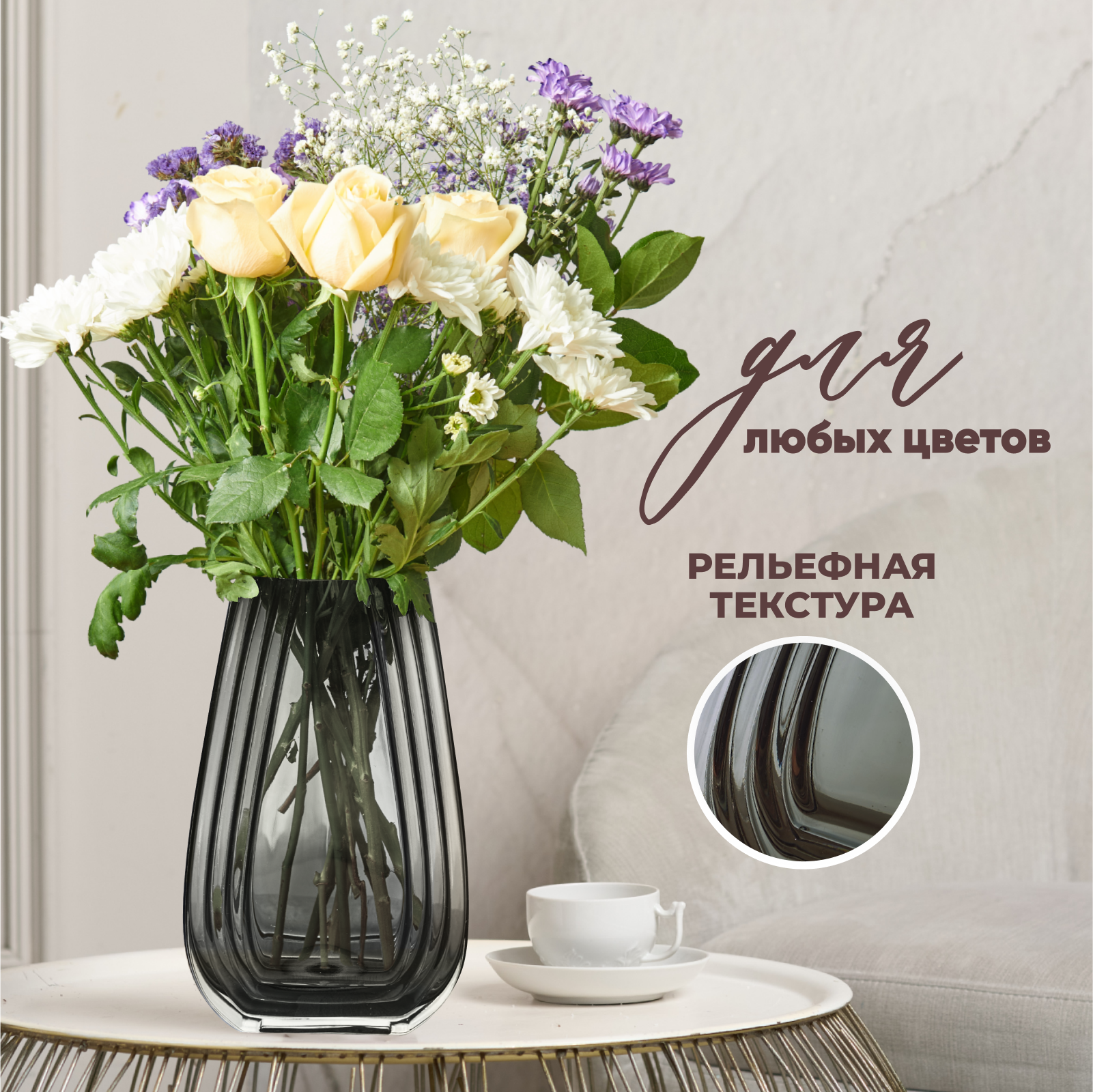 Ваза для цветов и сухоцветов декоративная, серая, 2 л, круглая