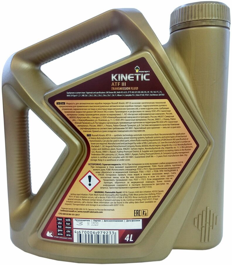 Масло трансмиссионное РосНефть Kinetic АТF III Рнпк 4л 40817542/23301 .