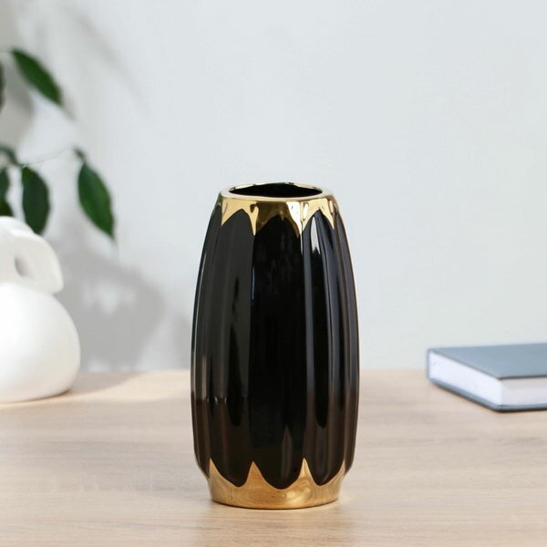 Керамическая ваза декоративная настольная «Дерк» полосы, для цветов, сухоцветов, d-9.5 см, h-24.5 см, золотисто-чёрный
